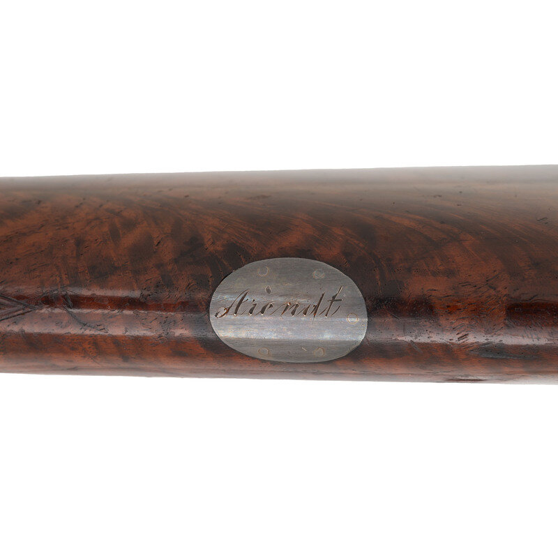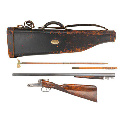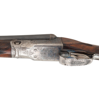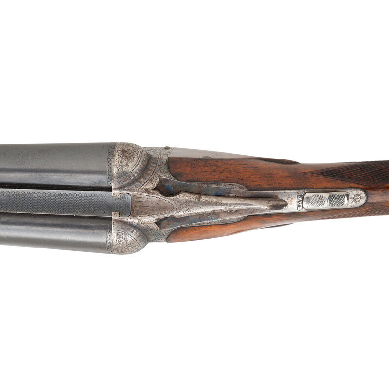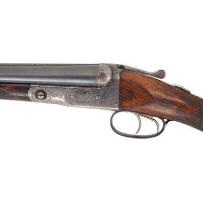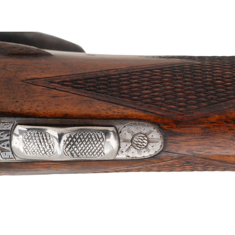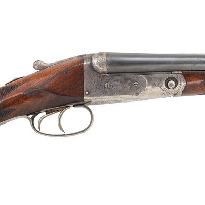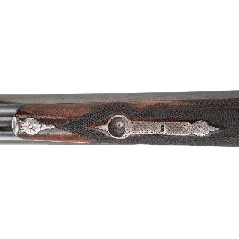 20 Gauge. 28" barrel length. SN: 193985. Blued barrels with casehardened frame mounting engraved skeleton buttplate on a walnut straight English style stock paired with splinter forend. Double barrel side by side boxlock extractor shotgun mounting a single front bead sight on a matted barrel rib that retains the border at the muzzle. Maker mark to barrel reads PARKER BROS. MAKERS. MERIDEN. CT. U.S.A. TITANIC STEEL. Frame is engraved with PARKER BROS banners enclosed by spiral scroll engraving with further game scene vignettes showing {pointers} to both flanks and {Pheasants} to lower frame. Item features highly figured walnut stock with bordered multipoint checkering to wrist and forend, and an oval plate to the toe engraved with the name Arendt. Shotgun shows the DH model stamp to the watertables along with triple patent dates of 1887, 1910, and 1905. Barrel lug shows the 20 gauge marking and a 0 frame size mark. Comes with a leather "Leg of Mutton" pattern travel case. 14" length of pull. 1.625" drop to comb. 2.75" drop to heel. {C&R}