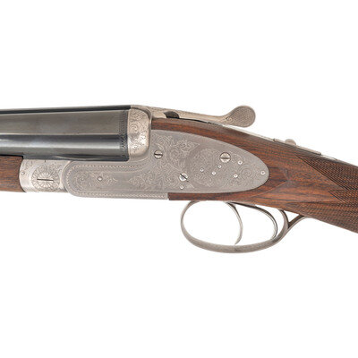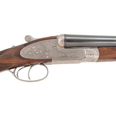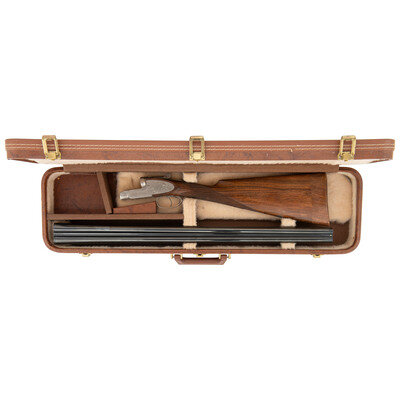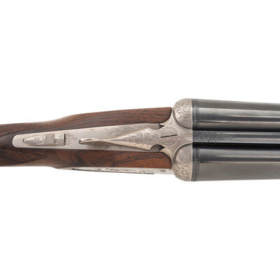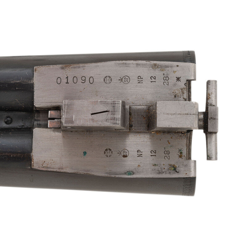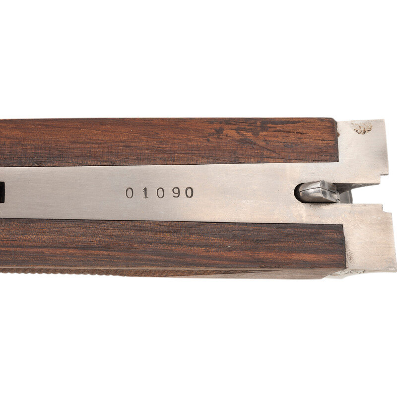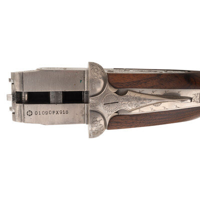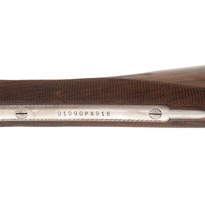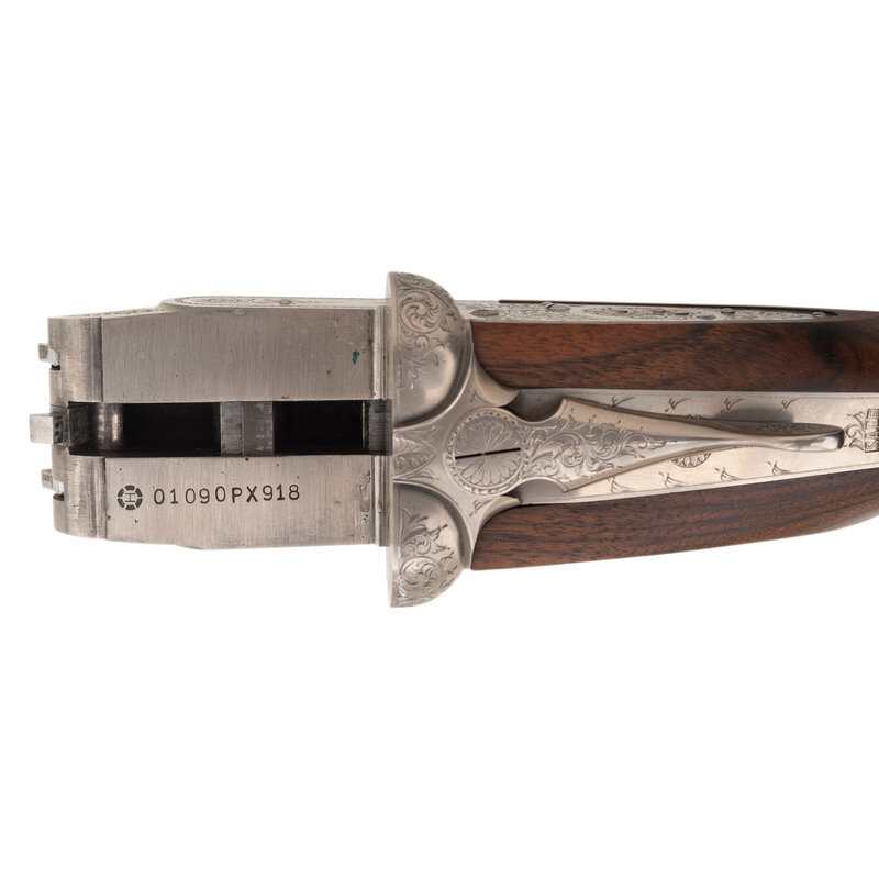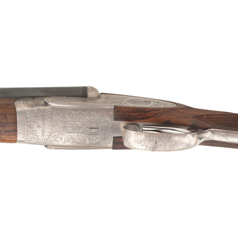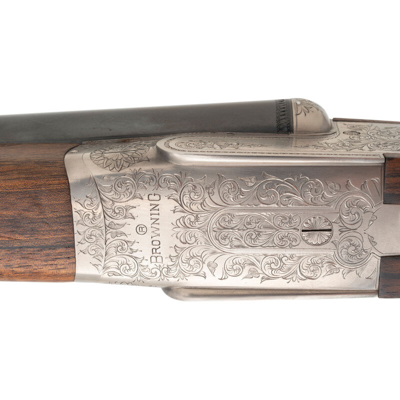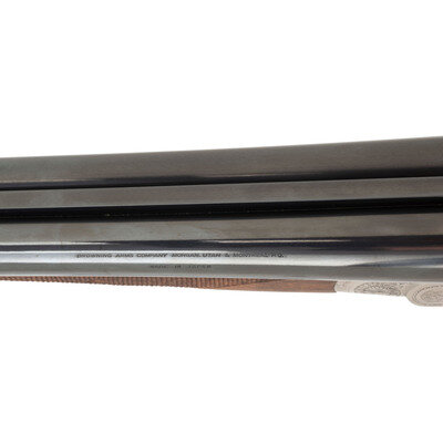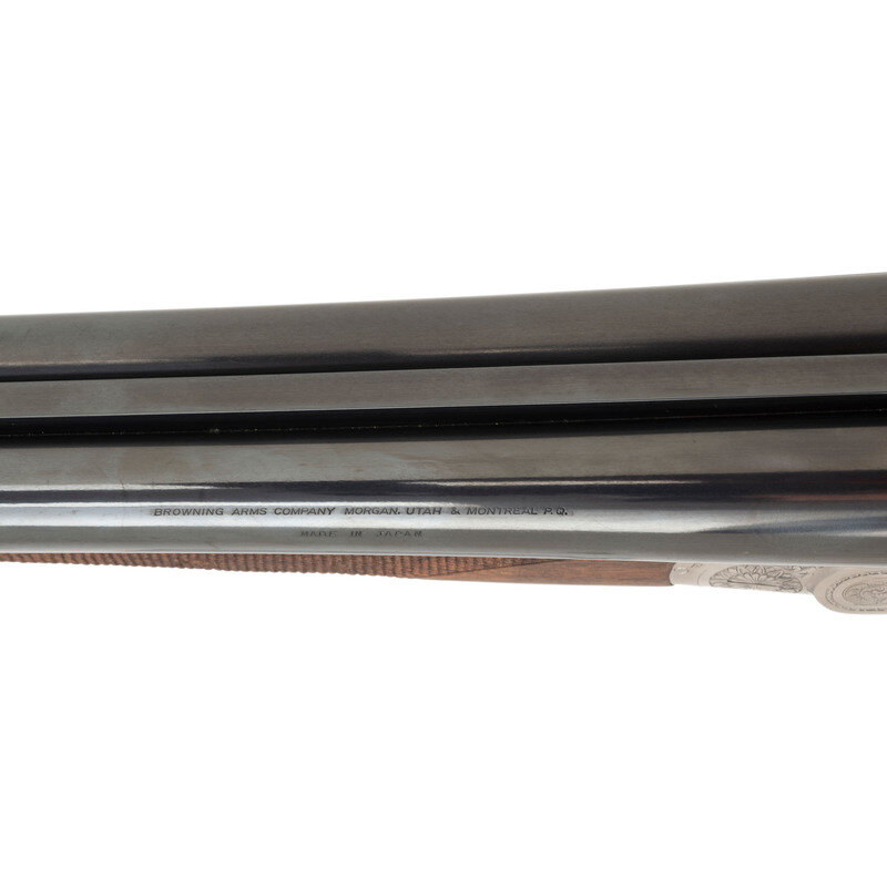 12 Gauge. 28" barrel length. SN: 01090PX918. 2.75" chamber length. Full Choke Left. Modified Right. Blued barrels with remaining parts showing a polished stainless steel finish set in walnut straight wrist stock with splinter forend and bordered multipoint checkering. Double barrel side-by-side hammerless sidelock shotgun with seven-pin action. Maker mark to left barrel reads BROWNING ARMS COMPANY MORGAN, UTAH & MONTREAL, P.Q./MADE IN JAPAN. Frame further shows a BROWNING mark to the lower frame forward of trigger plate. Standard caliber and manufacturer markings elsewhere. The Toe of the stock mounts an unsigned silver oval plate. Stock currently mounts a 1.75" long walnut extension with a naked butt. Engraving to the frame and sideplates features spiral scroll enclosing floral bouquets. Engraving continues over the triggerguard and the rear barrels. Comes with its original Browning travel case with Browning market survey card and an order for for Hamilton's County Clothing & Sporting Gear. 16" length of pull. 1.625" drop to comb. 2.75" drop to heel. {MODERN}