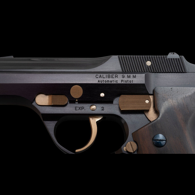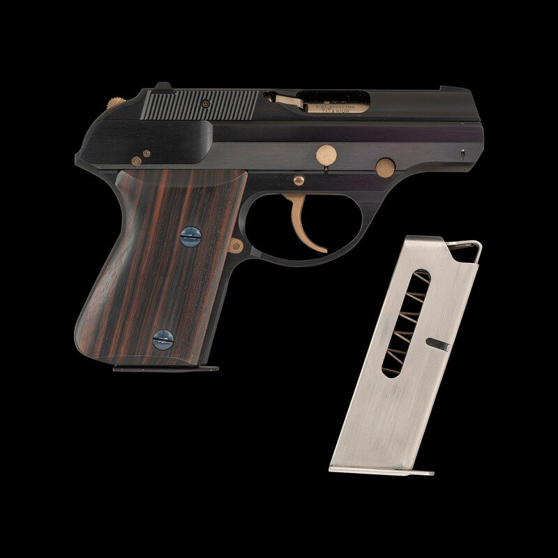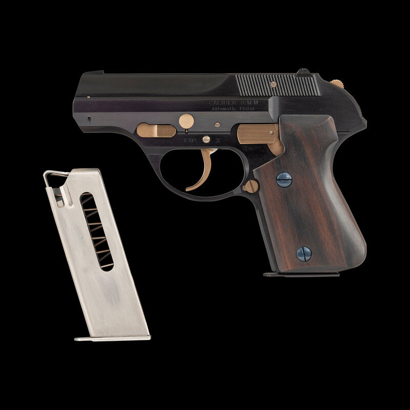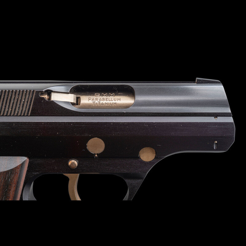 9mm Para. 2.875" barrel length. SN: EXP. 2. Black anodized finish to titanium parts with small parts showing a bright bare titanium color, blued grip screws, and smooth two-piece rosewood grips. Short recoil operated DA/SA autoloading prototype pistol fed by detachable single stack eight-shot magazines. The design follows the Mauser HsP, featuring a tilting locking wedge below the barrel, takedown lever to the forward frame, and a decocker to the left frame behind the trigger. Sights feature a gold frontal bead and a single rear gold post set within notch sights. The markings on the pistol include CALIBER 9MM/Automatic Pistol to left frame, serial number to frame, and barrel marks reading 9MM/PARABELLUM/TITANIUM. Comes with a total of two magazines, a black anodized alloy magazine, and a bright finished steel magazine marked 2 near floorplate.