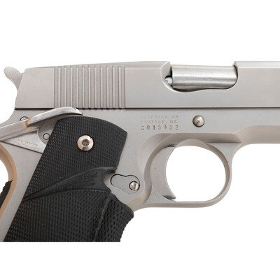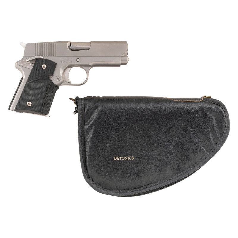 .45 ACP. 3.5" barrel length. SN: CR15452. Matte stainless steel finish overall mounting Pachmayr black rubber wraparound grips and featuring a Pachmayr checkered rubber lined backstrap and no iron sights. Short recoil operated single action autoloading pistol fed by detachable single stack magazines. Left slide is engraved DETONICS .45/MK VII, while the address mark to the right frame reads DETONICS .45/SEATTLE, WA. Item mounts a brightly polished barrel and vertically serrated trigger. Additionally mounts an ambidexterous safety lever struck A.D. SWENSON/FALL BROOK. CALIF. Item comes in a vinyl soft case with gold DETONICS lettering printed to exterior.