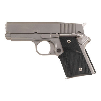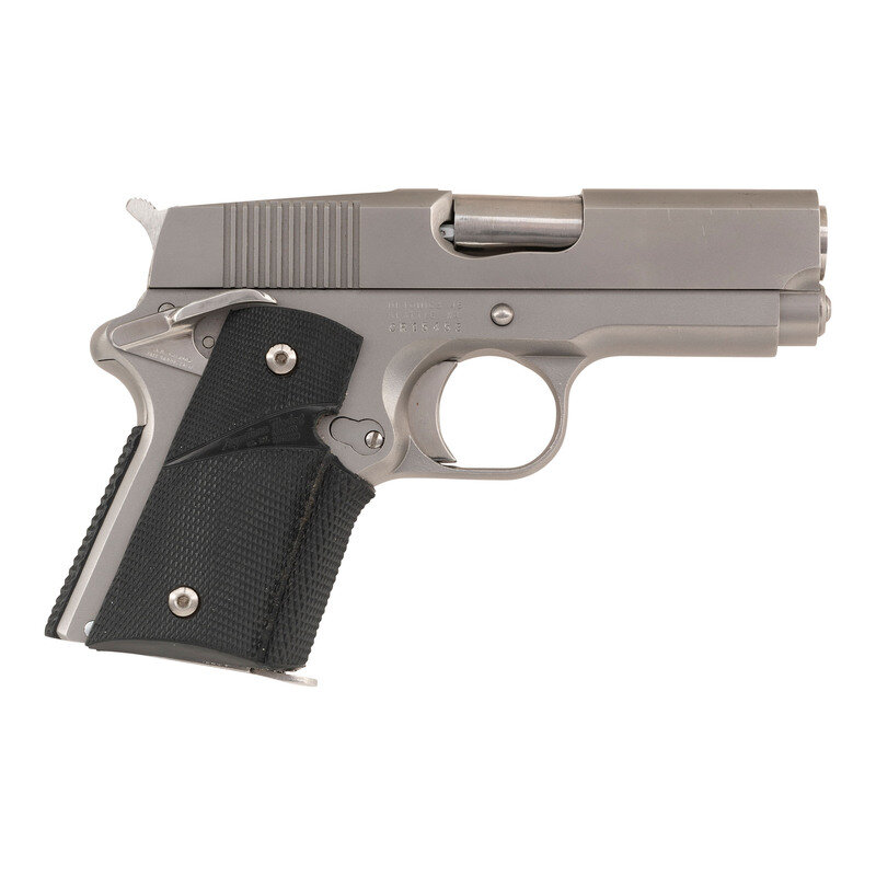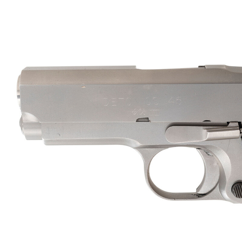 In the early 1970s, when no such thing a Colt 1911 "officers" model existed, the only way to get a hideout sized 1911 was to have one "chopped and channeled" by a custom pistolsmith. Enter the Detonics company of Bellvue, later Seattle, WA that brought the compact concealment 1911 into its own and made it reliable as well. The guns featured shortened frames, slides and barrels to enhance concealability and the custom upgrades demanded by people like law enforcement officers who relied upon their firearms to to keep them alive. After filing for bankruptcy in the early 1980s, the firm was purchased and reborn under new ownership and continued to produce guns into the late 1980s. This is one of the latter day Detonics pistols, with the classic DETONICS 45 slide mark on the left, over Mk VII. The lower right of the frame has the model, location and serial number, as was standard on the mid to late 1980s production guns. Some of the special features of the Combat Master include the tapered, cone-muzzle bushingless barrel that would become a standard feature on later compact 1911s, a full-length recoil guide rod, a short spur hammer, a pinned in place extended beavertail grip safety and a specially contoured top rear to the slide that allowed for easy thumb cocking of a pistol carried in "Condition 2". This machining also pushed the rear sight of the standard production pistols forward about 1.25" from the usual location, which provided a better sight picture. The Mark VII pistols were produced without sights and with the matte stainless steel finish. Detonics would become a serious innovator in the production of stainless steel pistols. The pistol is accompanied by a single Detonics marked magazine. The Detonics came into its own as a pop culture firearm when it was used during seasons 1-3 of Miami Vice as Detective "Sonny" Crocket's back up gun, worn in an ankle holster. {MODERN}