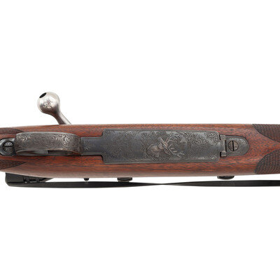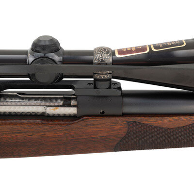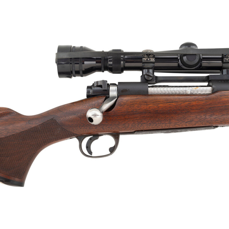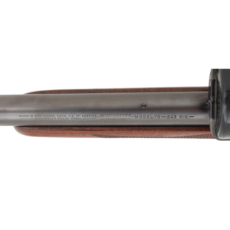 .243 Winchester. 26" barrel length. SN: 457672. Matte blued finish to the barrel and receiver with jeweled bolt and extractor, polished bolt handle, and a walnut Monte Carlo style stock with rosewood pistol grip cap featuring ivory diamond insert, and a checkered black synthetic buttplate. Bolt action internal magazine fed repeating rifle mounting a Redfield one piece scope base with custom engraved scope rings featuring Arabesque embellishments enclosing a Redfield 4X-12X telescopic sight. Left receiver displays standard WINCHESTER/TRADE MARK. Left barrel marks read MADE IN NEW HAVEN, CONN. U.S. OF AMERICA-WINCHESTER-/-WINCHESTER PROOF STEEL-TRADE MARK-MODEL-70-243 WIN.-. Receiver and barrel exhibit standard Winchester monogram firing proof marks. The barrel is drilled and tapped to install iron sights, but currently mounts thread protectors. Magazine floorplate is deep relief engraved with a buck profile emerging from an oak leaf and acorn wreath with arabesque scroll borders that flow over the triggerguard and trigger plate. Initials EZ on forward triggerguard beneath magazine floorplate. {C&R}