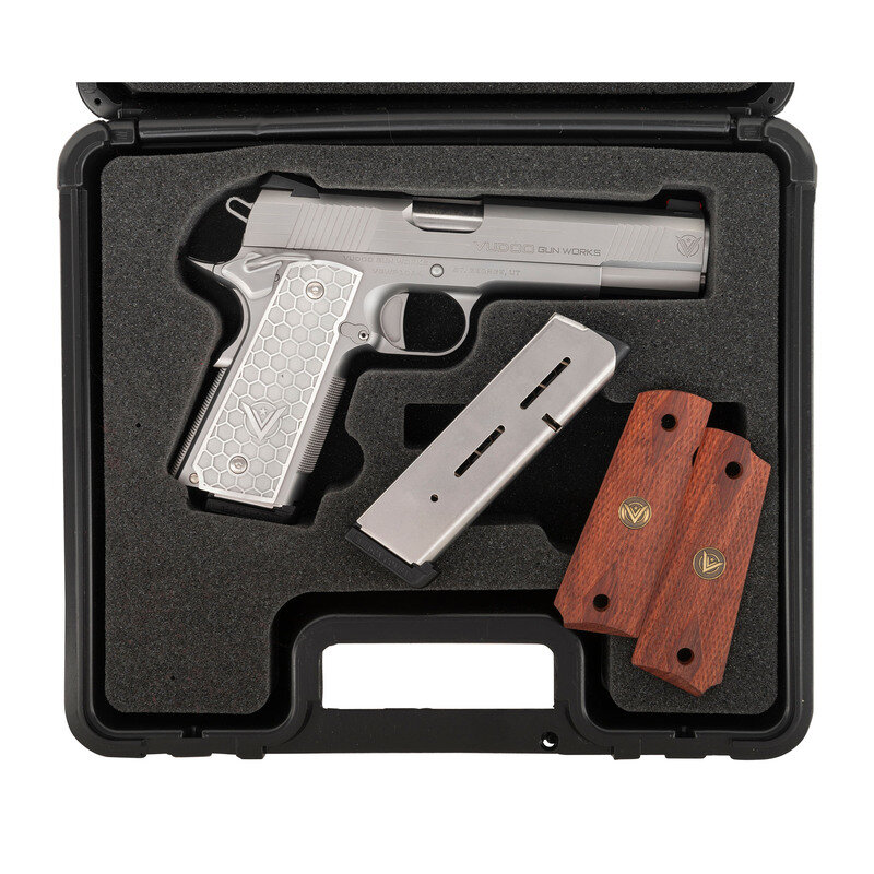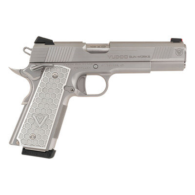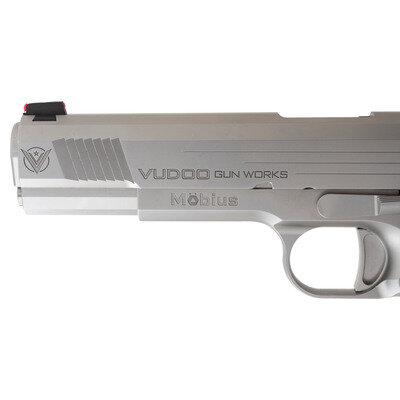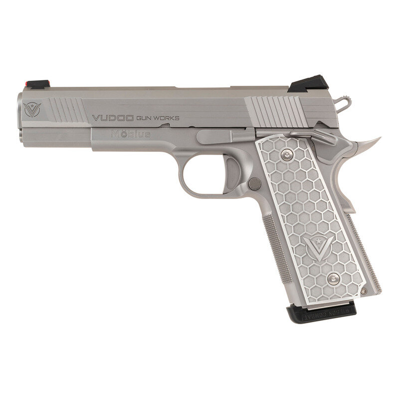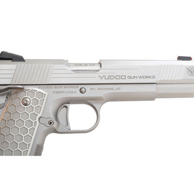 .45 ACP. 5" barrel length. SN: VGWP1064. Matte stainless steel finish overall mounting honeycomb texture aluminum grips with Vudoo Gun Works logos. Short recoil operated single action autoloading pistol fed by detachable single stack magazines. Markings include VUDOO GUN WORKS and V logos to both sides of the slide, Mobious model mark to left frame, and single line address to right reading VUDOO GUN WORKS ST. GEORGE, UT. Item features a high cut frame with checkering to forward gripstrap and to flat mainspring housing, front and rear cocking serrations, skeletonized Commander hammer, ambidexterous and extended safety lever, extended magazine release, extended beavertail grip safety, full length guide rod, adjustable NOVAK rear notch and red fiber optic front sights, and a flat scalloped trigger. Item comes in matching black synthetic hard case with one spare WILSON COMBAT magazine and a pair of diamond checkered wood grips with Vudoo medallions. {MODERN}