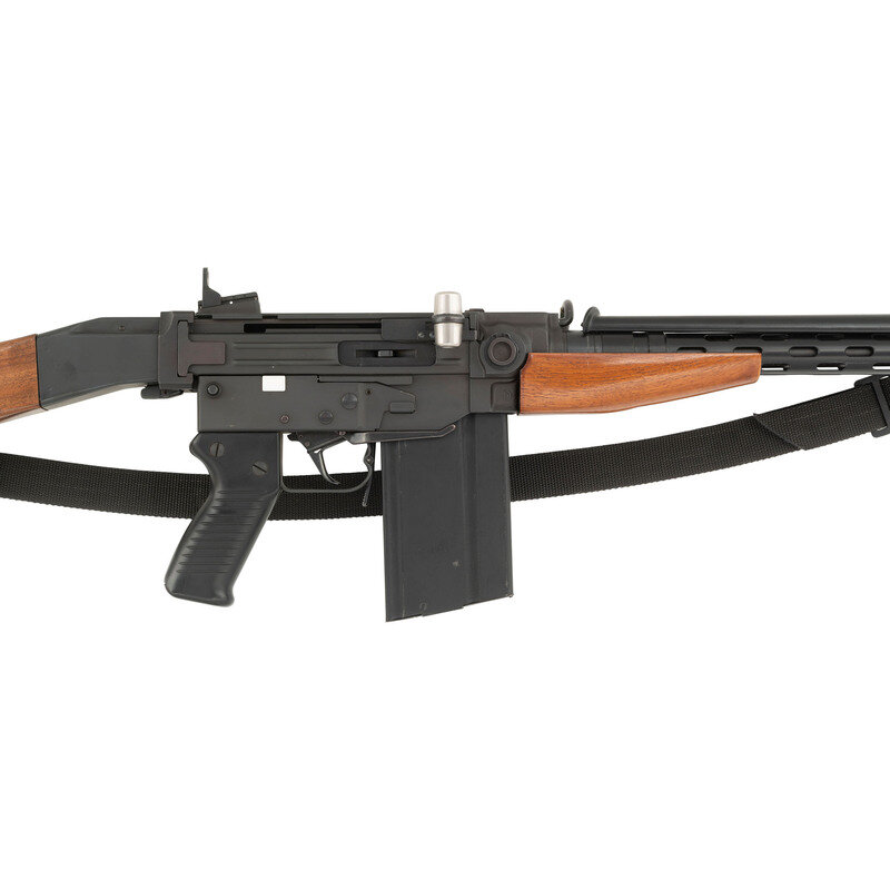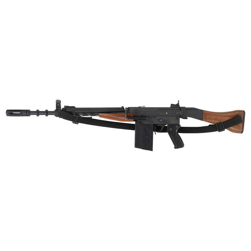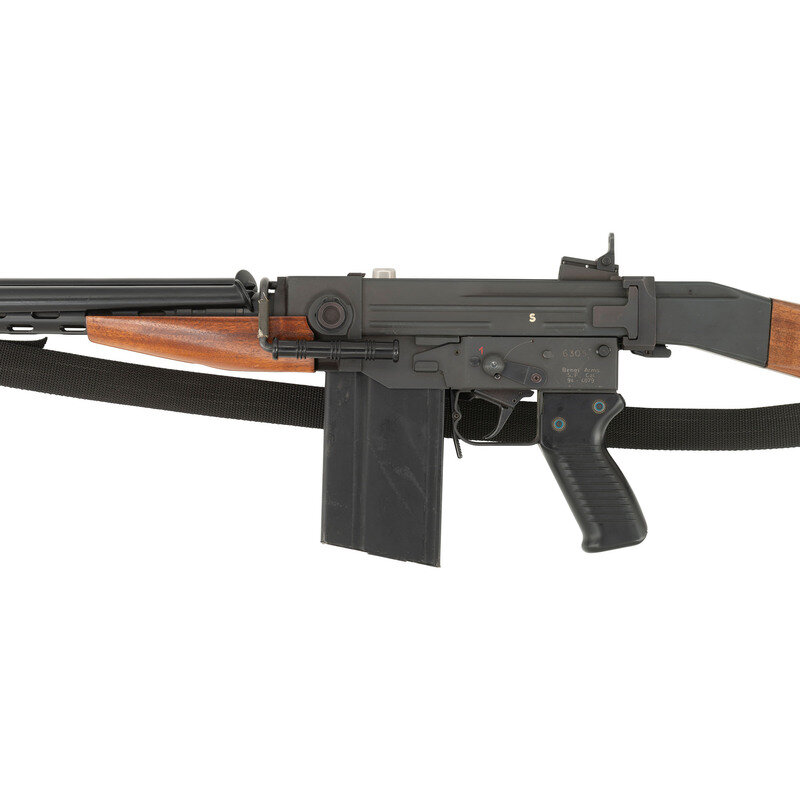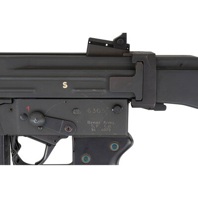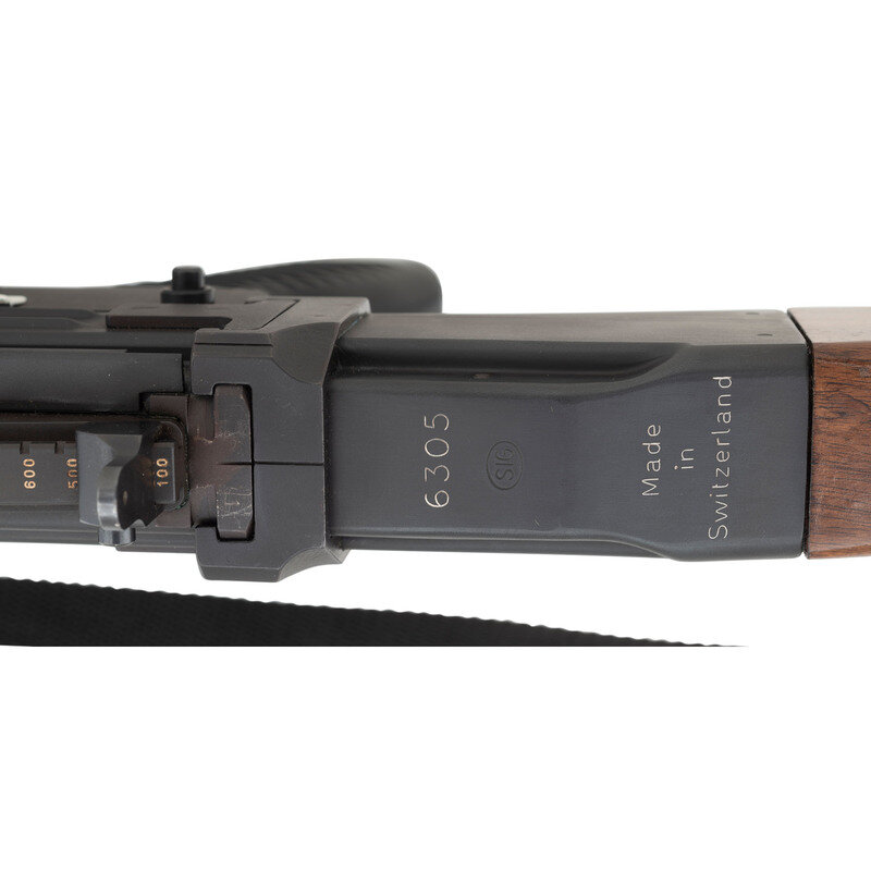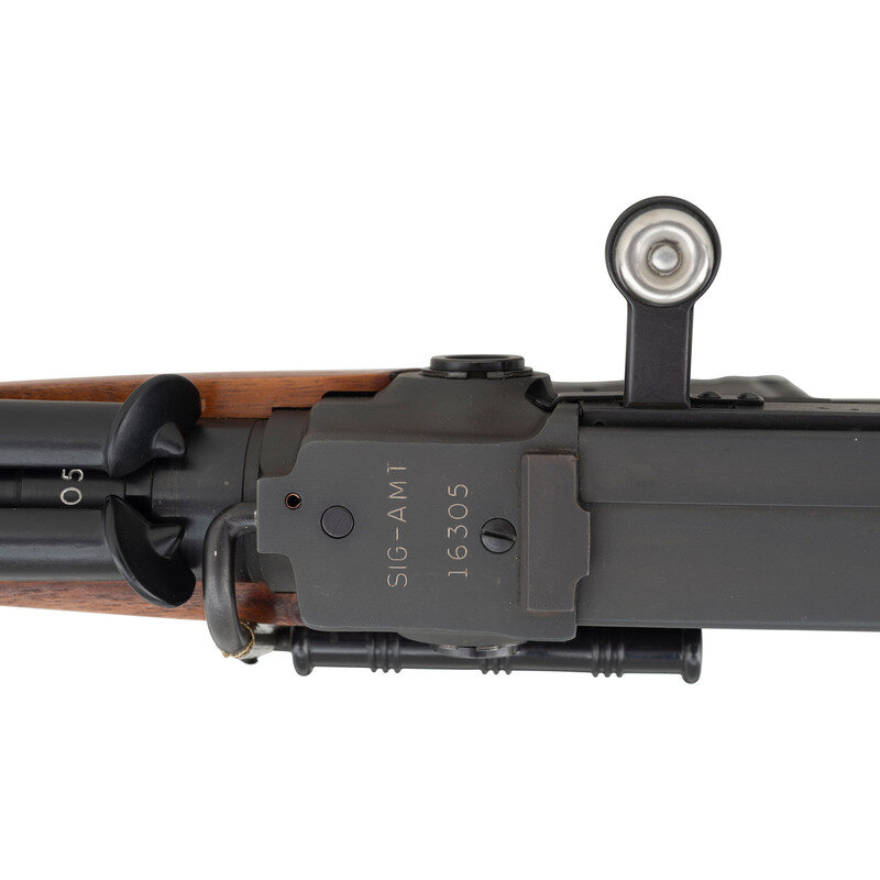 7.62x51mm. 20" barrel (Without muzzle device). SN: 16305. Parkerized and Blued metal finish with polished walnut furniture and black synthetic pistol grip. Roller-locking delayed blowback operated semi-automatic rifle fed by detachable box magazines. Rifle mounts a folding bipod, adjustable rear notch and front post sight with protectors. Muzzle fitted with a "birdcage" flash hider with grenade launching rings, and a two-position safety to left receiver. Markings include SIG stamp and Made/in/Switzerland engraved into stock socket, SIG-AMT to the upper receiver, and matching serial numbers where observed. Left receiver shows importer marking Benet Arms/S.F. Cal./94-4079. The rifle features an alloy T-shaped charging handle, and comes with one 20-shot magazine and a black nylon sling. A length of duct tape has been wound over the edge of the carry handle to preserve the finish of the forend. The Sig AMT, or American Match Target, rifles were a semi-automatic only derivative of the Sig 510-4 rifle. Imported by Benet between 1969 and 1989, it is estimated that approximately 3,000 of these rifles entered the United States through all importers, making this firearm a rare sight. {MODERN}
