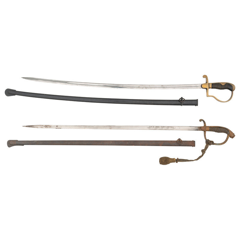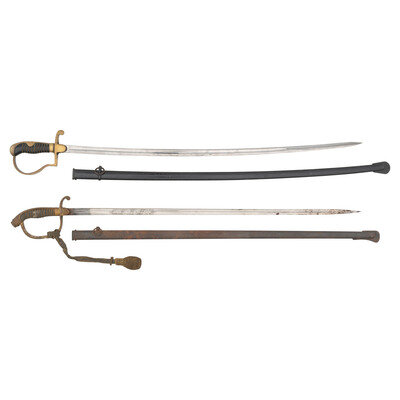 2) 33" blade length. 39.5" overall with scabbard and hilt. Bavarian Officer's Pallasch with straight single edged double fullered blade with spearpoint tip and mounting a brass hilt with knuckle bow. Blade is etched with the Bavarian motto IN/TREUE/FEST to both sides of the blade enclosed by oak leaves and acorns. Hilt cast with a rampant lion design to both obverse langet, a shield to the reverse, and oak leaves over the backstrap and guard. Shagreen grip is wire wrapped.