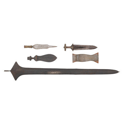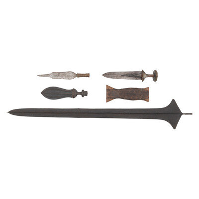 2.) 10" blade length. 14.5" overall with hilt. Straight double edged leaf shape blade with medial ridge and blade adorned with five ridged border in a wood hilt. Hilt is decorated with tacked wire woven designs. Ikula knife of the Kuba Tribe native to the Congo.
