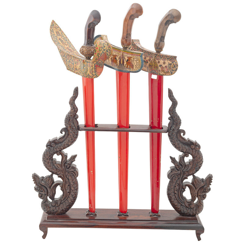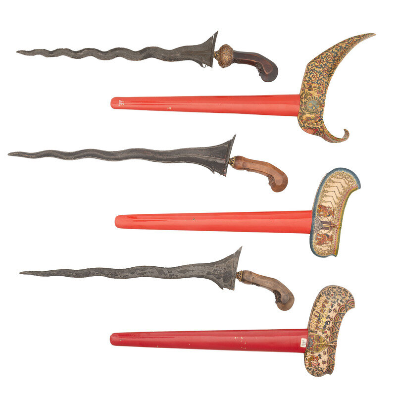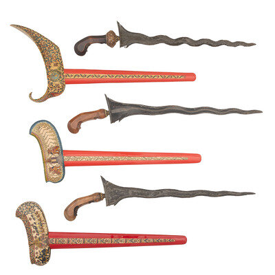 1.) 15.5" blade length. 20.25" with scabbard and hilt. Double edged serpentine wootz steel nine luk blade with carved wood handle and a brass bolster containing glass beads. Item comes with a Sunggingan style scabbard with red painted border and the throat decorated with elaborate geometric and floral patterns enclosing standing figures meeting around the blade.