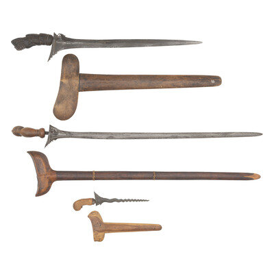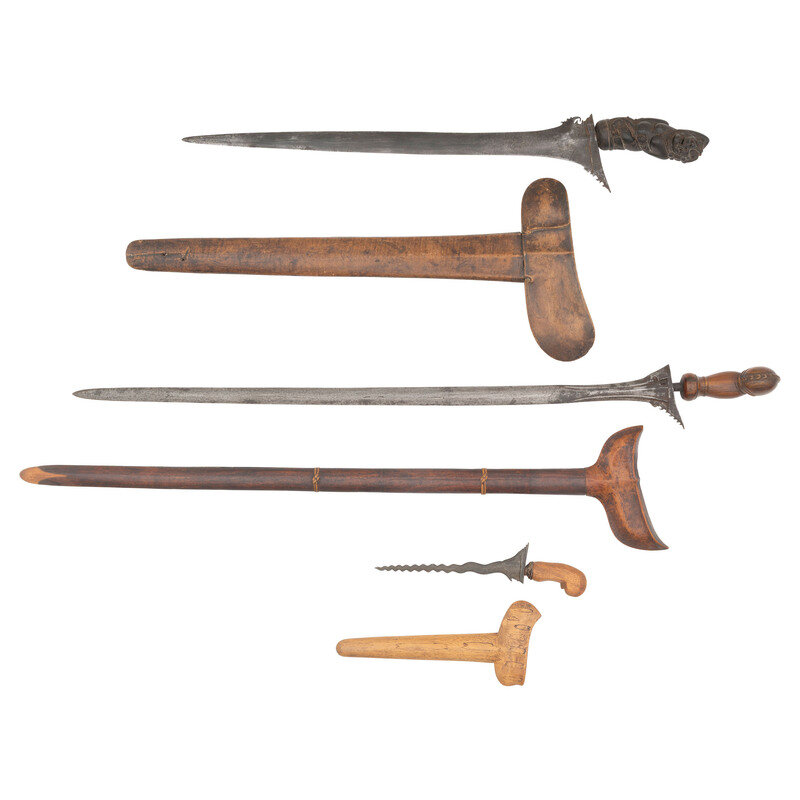 3.) 26" blade length. 31" overall with scabbard and hilt. Straight double edged wootz steel blade mounting a carved wood handle and scabbard. Blade features a reinforced ricasso with carved folds. This pattern of sword is also known as an Executioner's Keris, and such swords were used in this role historically.