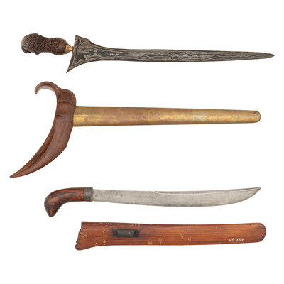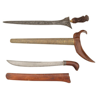 2.) 15.5" blade length. 19.5" overall with scabbard and hilt. Straight double edged wootz steel blade mounting a wood handle carved in the Donoriko style. Scabbard is Javanese with ladrang style warangka. Scabbard is decorated with embossed floral designs with a matching pattern ferrule bolstering the pommel.