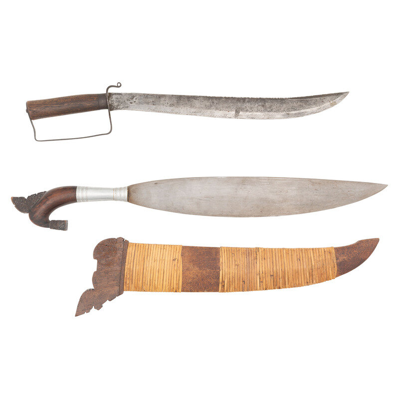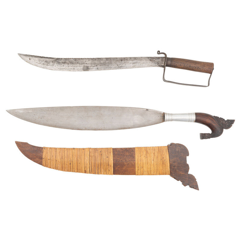 2) Moro Barung with 17.75" blade length. 26.75" overall with scabbard and hilt. Single edged leaf shaped blade with drop point mounting a carved wood pommel with intricate ukkil patterns, and a tin ferrule. Item comes in a varnished wood rattan bound scabbard.