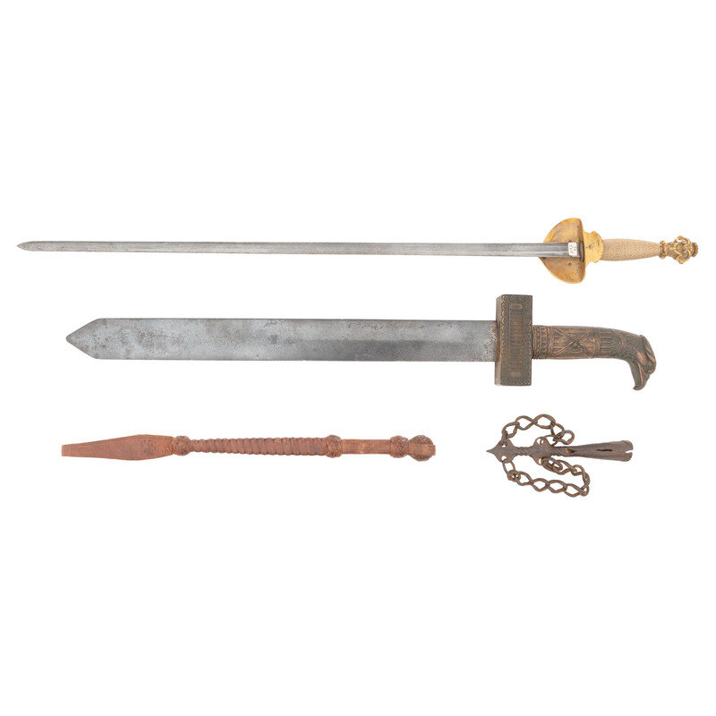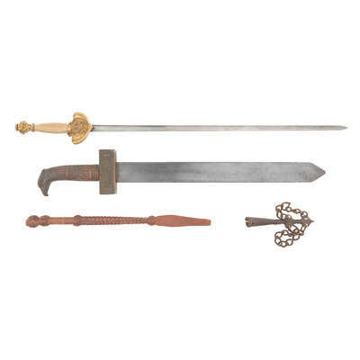 1) 20th Century US Diplomatic Sword. 26" straight tapering spear point blade. 31.25" in overall length. 5" gilt cast brass hilt with decorated urn pommel and chased US eagle on the face of the clamshell guard.