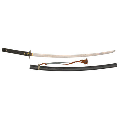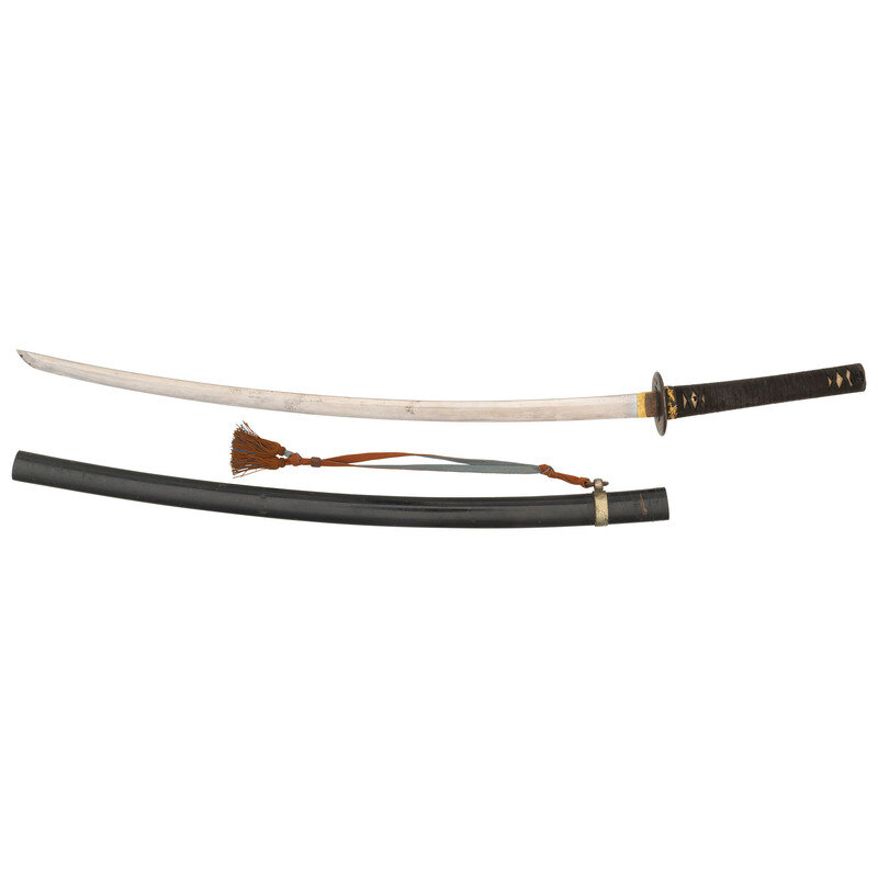28.7" Nagasa (Blade Length). 38.8" with Tsuka (Hilt) and Saya (Scabbard). Shinogi-Zukuri pattern blade with Toran style Hamon line and mounting Gold finished and Shakduo Habaki. Item features a Mei (Signature) to the Nakago (Tang) and on the iron Tsuba. The Nakago features triple Mekugi Pin ports. The Kogai Hitsu-Ana has been filled in with black finished Shakudo plug, and the Tsuba retains its deep browned finish with gold and black Shakudo lined ports and details. Tsuka has black grip tape enclosing rayskin Same. Both the Fuchi and Kashira are black finished Shakudo decorated with gold dragons among black clouds over a Nanako ground. Comes with a black painted wood saya with nonferrous metal loop. The loop mounts a brown and blue WWII Japanese Army style sword knot.