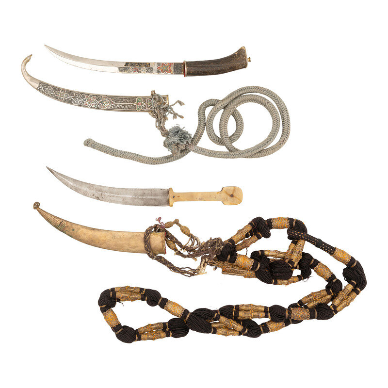 2.) 10" blade length. 15.4" overall with scabbard and hilt. Curved single edged blade sharpened in the fashion of a Moroccan Koummya and featuring a horn hilt, engraved Arabesque patterns to the blade flanks with Arabic inscriptions to the right side. Comes with an engraved nonferrous scabbard with patterns matching the blade. Scabbard mounts a gray woven cord shoulder strap.