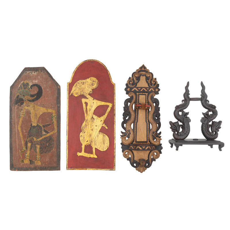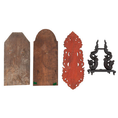 Display boards measure between 25" and 26.5" in height and 9.75" to 11" in width. All boards are made of wood, two with carved human figures and a third elaborately carved with entwined dragons. Display stand is 15" tall and 11.5" wide. The finish is a dark varnish with the stand itself carved in the shape of two dragons.