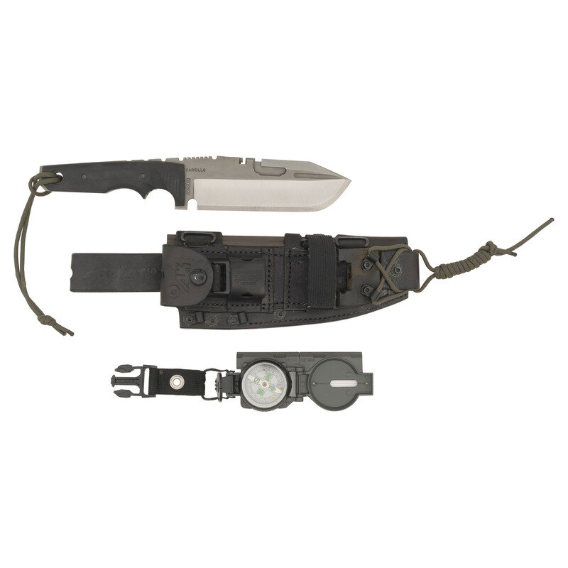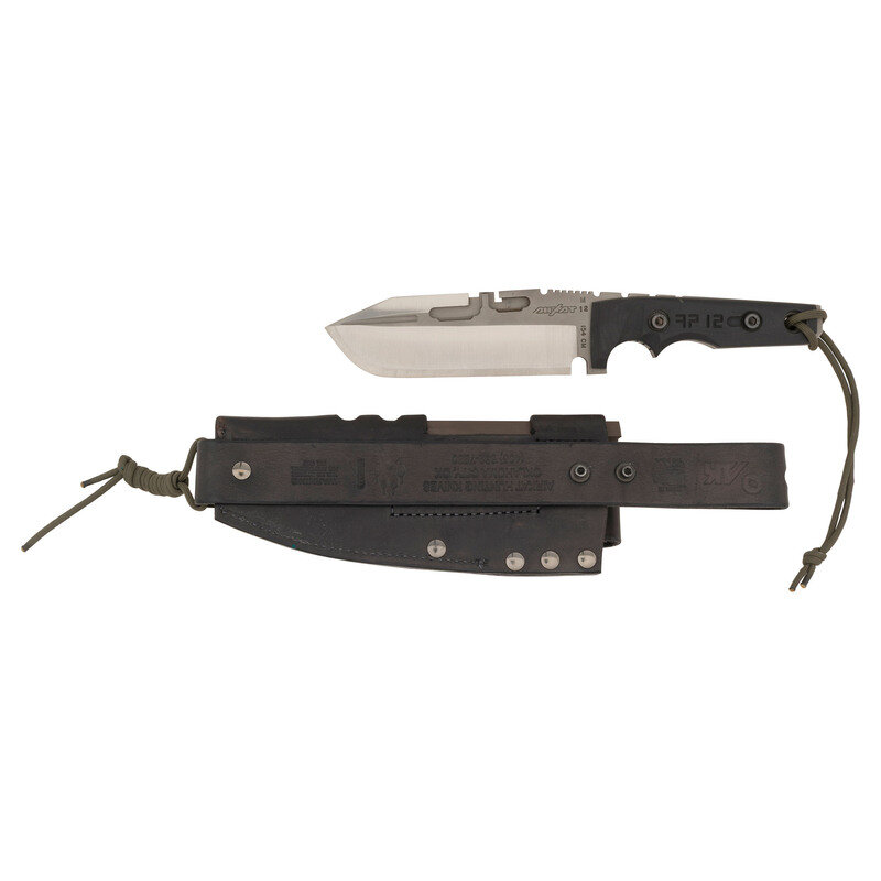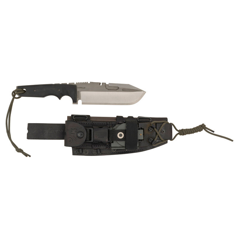 6" blade length. Straight modified Tanto point single edge blade with black G10 grip scales, full tang construction, and channel cuts to the blade. Left blade is struck with AIRKAT marking along with M, 12, and 154 CM marks. Right blade struck CARRILLO and APACHE. Left grip scale is engraved FP 12. Lanyard loop to the pommel with OD green paracord lanyard. Item comes with a matching AIRKAT marked black leather sheath containing a lensatic compass, a sharpening rod, and a magnesium fire starter. Rear face of the sheath is stamped AIRKAT HUNTING KNIVES/OKLAHOMA CITY, OK with the front marked WARNING/THIS RIG INTENDED/FOR PROFESSIONAL/USE ONLY.