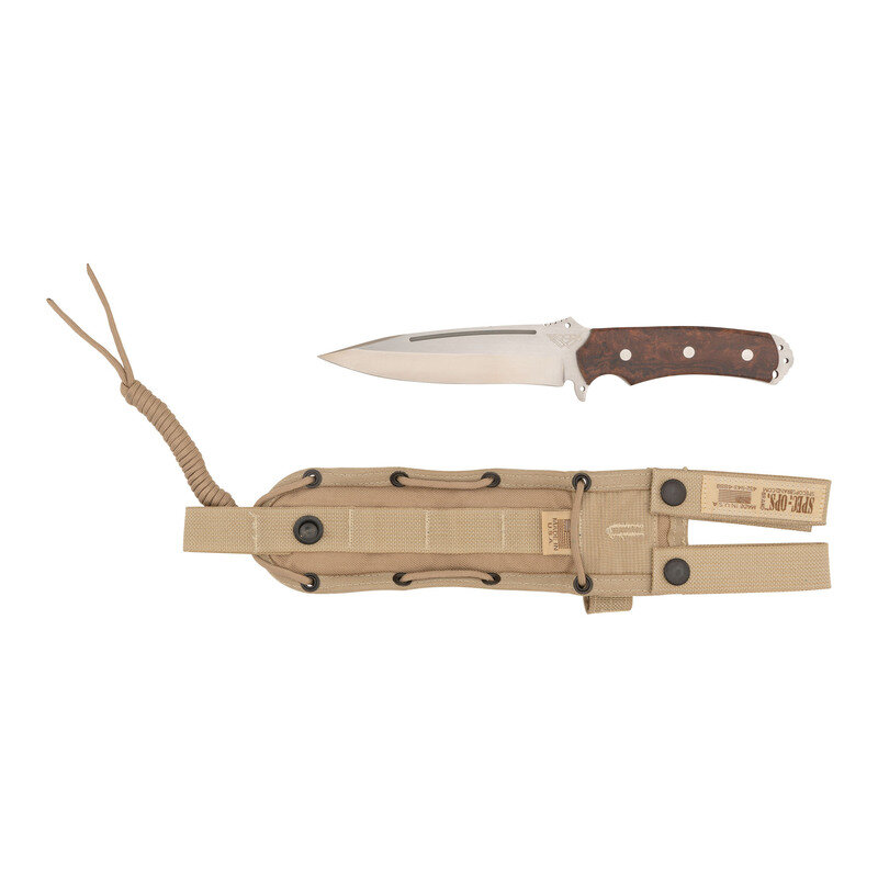 5.5" blade length. 14.5" overall with sheath. Straight single edged drop point knife featuring full tang construction and burlwood grips secured by three fasteners. Left ricasso engraved with the WOODS maker marking of Steve Woods. Item comes in a SPEC.-OPS. brand khaki nylon drop sheath. Steve Woods has manufactured custom knives since 2000. In addition to knifemaking, Woods remains an active professional photographer, whose images have appeared in various knifemaking publications and beyond.