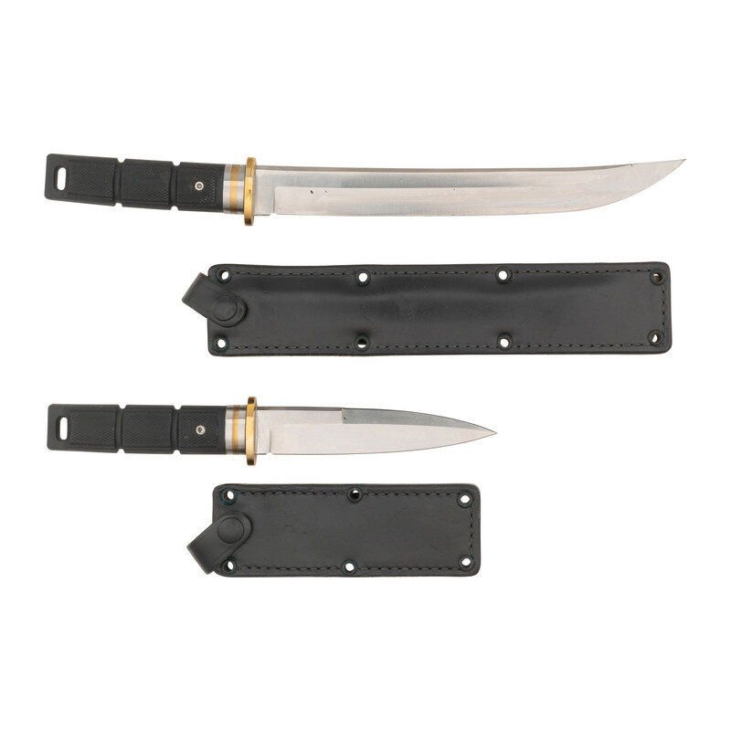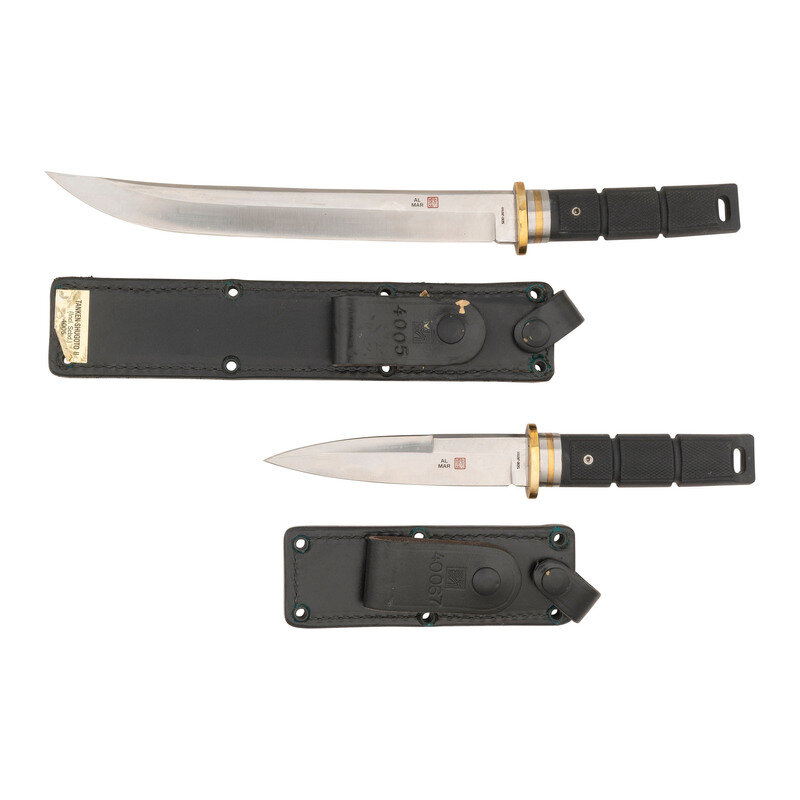 2.) 5.7" blade length. 10.5" overall with hilt. Straight spearpoint blade with unsharpened false edge featuring brass guard bolstered by brass and alloy spacers in addition to checkered black synthetic grips. Left blade displays AL/MAR maker mark and logo with left ricasso struck SEKI-JAPAN. Comes with a black leather sheath featuring construction similar to above example.