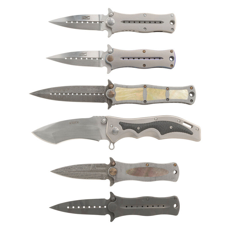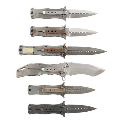 3) Darrel Ralph Designs assisted opening folding knife marked DDR/RPB on the obverse of the blade. 4" single edged Damascus patterned spear point dagger blade with thirteen holes in the central fuller and a 1.25" false edge. 8.625" in overall length. Liner lock design, with removable and reversible belt clip and mother of pearl grip inserts.