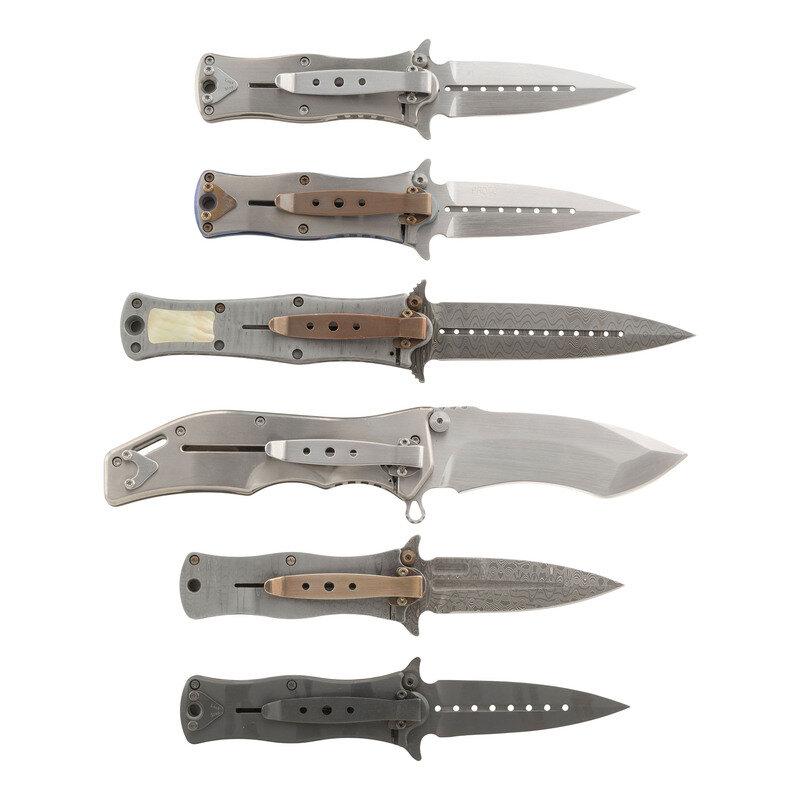 1) Darrel Ralph Designs etched logo assisted opening folding knife marked PROTO on the reverse of the blade. 3" single edged spear point dagger blade with eight holes in the central fuller. 6.75" in overall length. Liner lock design, with removable and reversible belt clip.