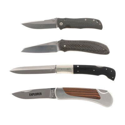 4) Edge Mark Japan Explorer folding knife. 3.75" drop point single edged blade, 8.5" in overall length. Smooth wood grip scales, back lock mechanism.