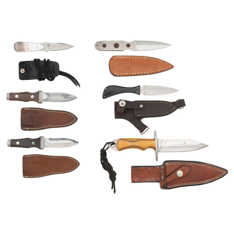 1.) 4.75" blade length. 10.5" overall with scabbard and hilt. Straight double edged Bowie knife with spearpoint tip and serrated spine mounting white and black synthetic G10 grips with skullcracker pommel, nylon lanyard, and leather sheath. Upper tang is engraved with the signature A.J. COLLINS. Alex J. Collins was an African-American knifemaker, and a member of the Knifemakers' Guild for more than 25 years by his passing in 2001. His blades are known for their unorthodox and elaborate grinds, made possible by his free hand approach, and well exemplified by pronounced medial ridge and hollow grinds of this example. When he attended shows, Collins sold his creations under the provocatively named "Kustom Krafted Knives."