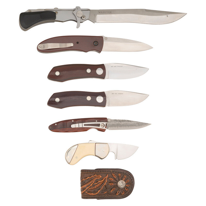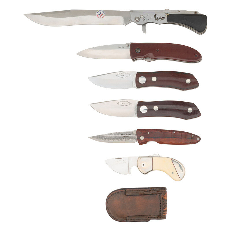 Lot of Six Folding Knives Including: Wildsteer, Hall, (2) Wood, MCUSTA and Hoffmann