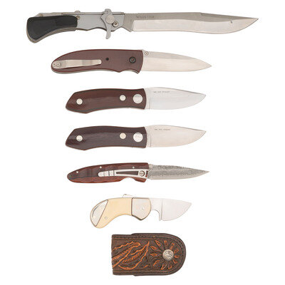 1) Wildsteer folder. 7.5" recurved single edged semi-clip point blade, 12.75" in overall length. Wood grip scales, lever lock mechanism, leather belt holster and box.