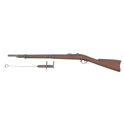 .45-70. 24" barrel length. SN: 135514. Blued finish with casehardened breechblock and polished lockplate mounting a walnut straight wrist stock with handguard retained by two U stamped barrel bands. Lockplate is marked {Spread Winged Eagle} followed by U.S./SPRINGFIELD, while the breechblock is marked US/MODEL/1878. Left barrel struck V/P/{Eaglehead}/P with further R stamp. Stock displays legible circle p mark and boxed SWP/1880 cartouche of Samuel W. Porter. Mounts no sights and has had the hammer removed, the barrel plugged, and the locking lever cut off to render it nonfiring. Fitted with a blunted practice bayonet. Fencing musket used for training infantry in the use of the bayonet prior to World War I. {ANTIQUE}