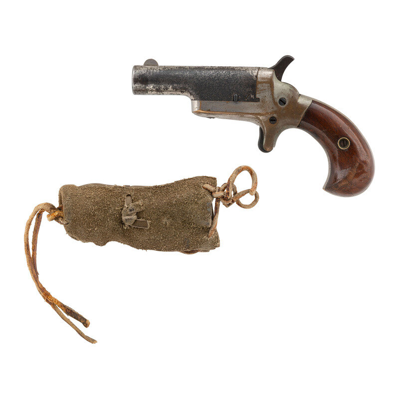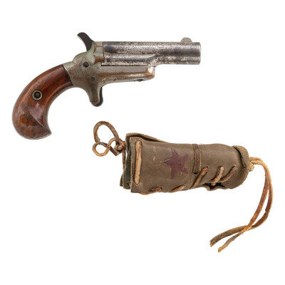 .41RF. 2.5" barrel. SN: 7451. Nickel finish, silver plated brass frame, smooth walnut grips. Single shot pivoting barrel single action spur trigger cartridge derringer pistol with no rear sight and German silver half-moon front sight blade. Top of barrel marked -COLT-. Includes an older leather pocket holster. Matching serial numbers written in both grips in pencil. From the Collection of Charles Worman, co-author of the two volume set Firearms of the American West. {ANTIQUE}