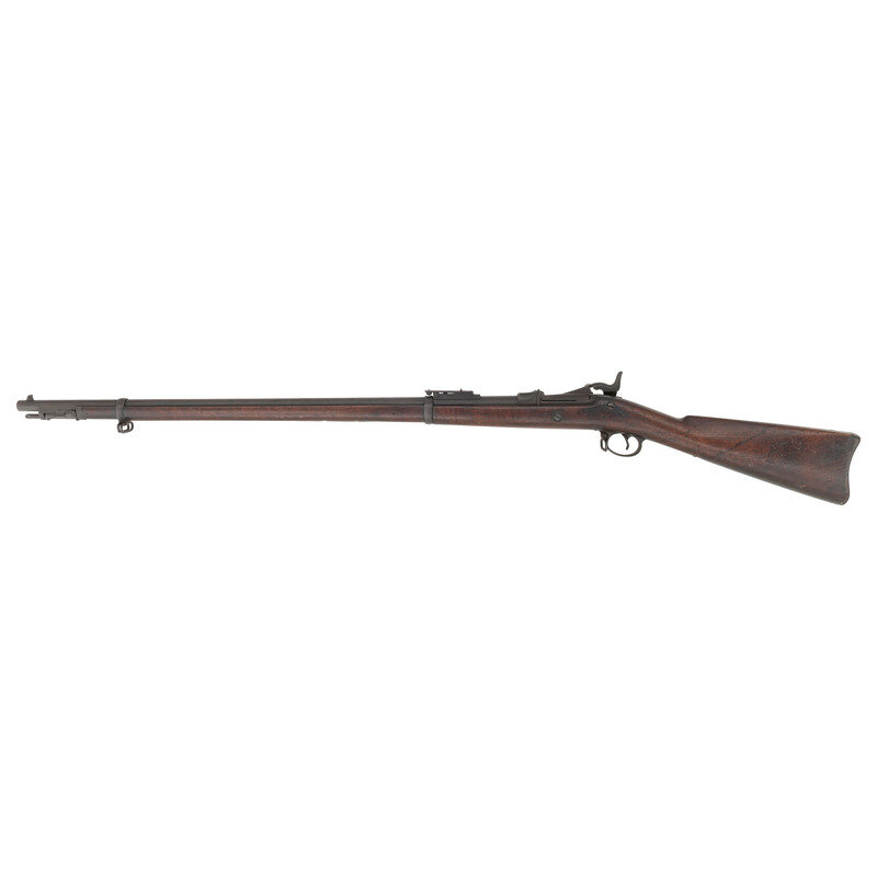 .45-70. 32.625" barrel. SN: 531702 (mfg. ca. 1891). Blued and casehardened finish, steel furniture, walnut stock. Single shot "trapdoor" action breechloading military rifle with M1884 Buffington rear sight, pinned front sight blade in base, ramrod bayonet, barrel secured by two spring retained solid barrel bands, sling and stacking swivel on upper band, sling swivel on triggerguard bow. 1884 breech block markings, standard lock markings. SWP/1892 cartouche on counterpane, {Circle-P} firing proof behind triggerguard. Butt stamped 7 on both sides and with 487 on obverse, painted E/82 on top of comb. Butt trap in stock is void of tools. THIS RIFLE IS NOT SAFE TO SHOOT. {ANTIQUE}