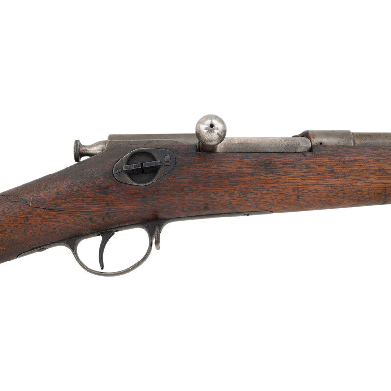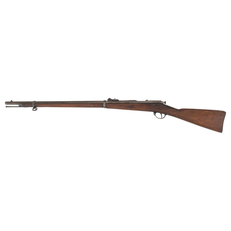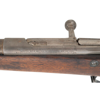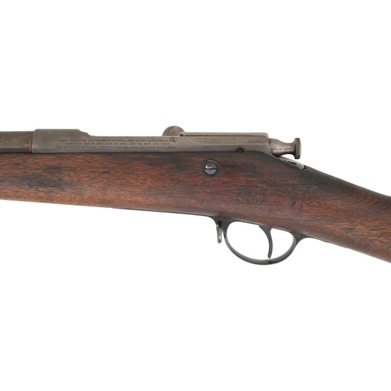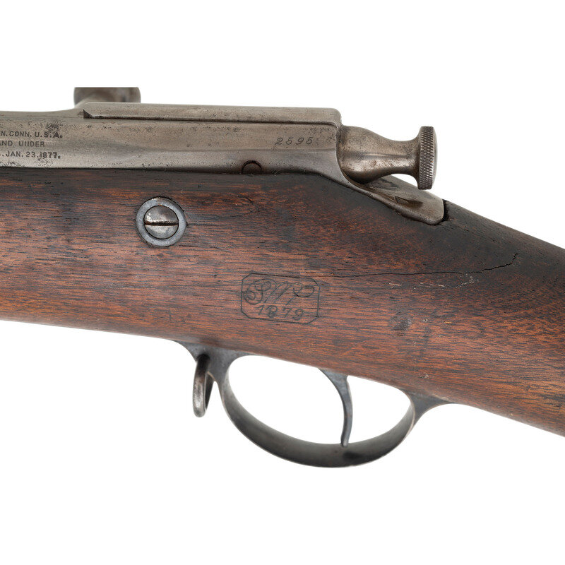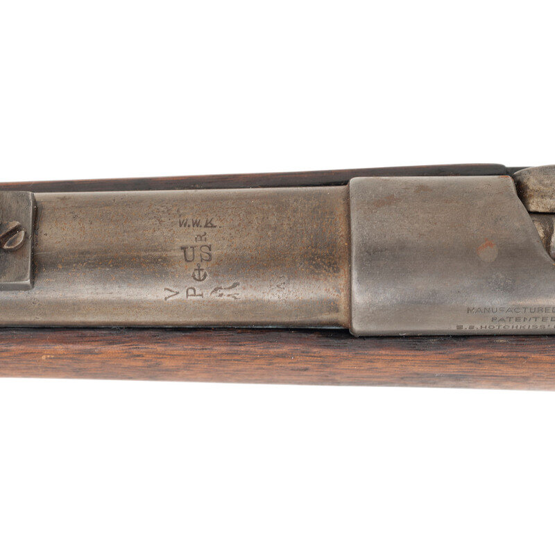.45-70. 29" barrel secured by two spring retained barrel bands. SN: 2595. Blued and color casehardened finish, full length walnut musket stock with musket style butt. Bolt action tubular magazine repeating military rifle. Top left of receiver marked in three lines with Winchester address and patent dates, ending with the date 1877. Top left edge of receiver with serial number and HN (Henry Nettleton) inspection. Barrel with Springfield V/P/{Eagle Head} inspection marks, and a W.W.K. for US Navy officer Willian W. Kimball over US over a naval {Anchor} inspection. Counterpane with clear script SWP/1879 cartouche. First model Hotchkiss safety and magazine cut-off on right rear of receiver, M1879 pattern long range rear sight, musket pattern front sight serves as lug for angular socket bayonet, sling swivel on front of triggerguard, sling and stacking swivels on upper barrel band. Includes a slotted 1879 type cleaning rod. Only 2,473 Hotchkiss Navy Rifles were produced, 1,474 of the first type and 999 of the second type. A scarce Indian War era US Navy long arm. {ANTIQUE}