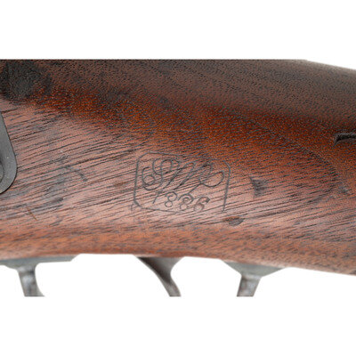 .45-70 (.45-55). 22" barrel. SN: 344353 (mfg. ca. 1885-86). Blued and color casehardened finish, walnut stock. Single shot Trapdoor action cavalry carbine with M1884 Buffington rear sight with a "C" marked ladder, a pinned front sight in base, saddle bar and ring, low arch breech, 3-click tumbler, grooved trigger and two-piece triggerguard. Standard markings on breech block and lock wth a clear SWP/1886 cartouche on the counterpane and a {Circle-P} firing proof behind the triggerguard. Butt trap is void of cleaning rods and the door is bent. {ANTIQUE}