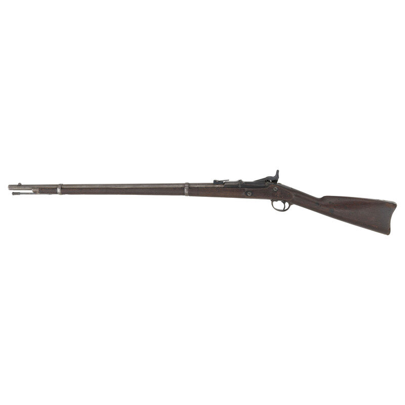 .50-70. 29.5" barrel length. SN: 1330. Blued metal finish overall mounting straight wrist walnut full length stock retained by two barrel bands. Single shot trapdoor action rifle mounting replaced adjustable rear ladder and front blade sights. Item features a narrow receiver, high arch breechblock, two-click action, spring-loaded firing pin, smooth trigger, and no sling loops. Markings include matching serial numbers to the left barrel and frame. Lockplate is dated 1863 behind the hammer and further marked {Spread Winged Eagle} forward of the hammer with U.S./SPRINGFIELD. Breechblock is struck 1870/{Eaglehead}/US. Stock is circle P marked to the rear wrist with the counterpane displaying a weakened circled ESA cartouche of inspector Erskine S. Allin, mastermind of the American trapdoor action rifles. Buttplate struck US and the upper barrel band is marked with a single U. Comes with a flat tipped cleaning rod. {ANTIQUE}