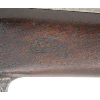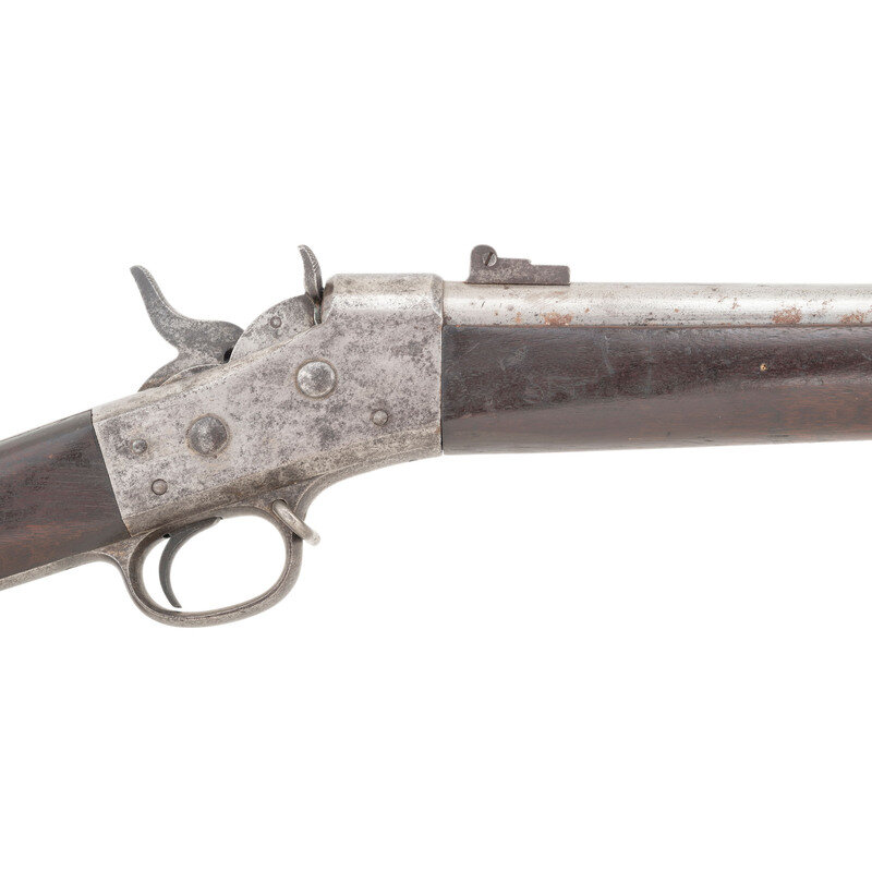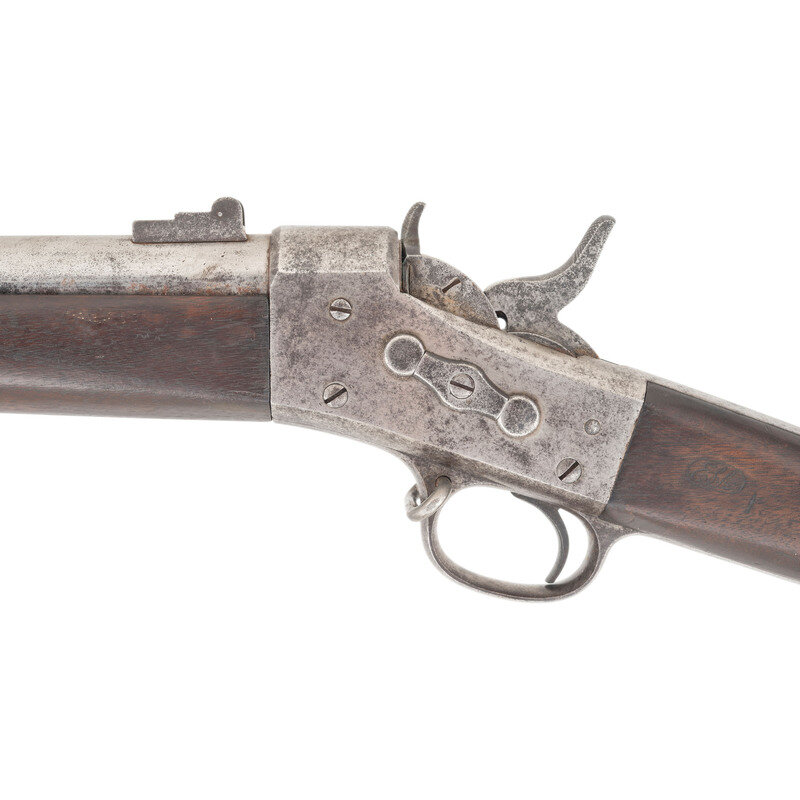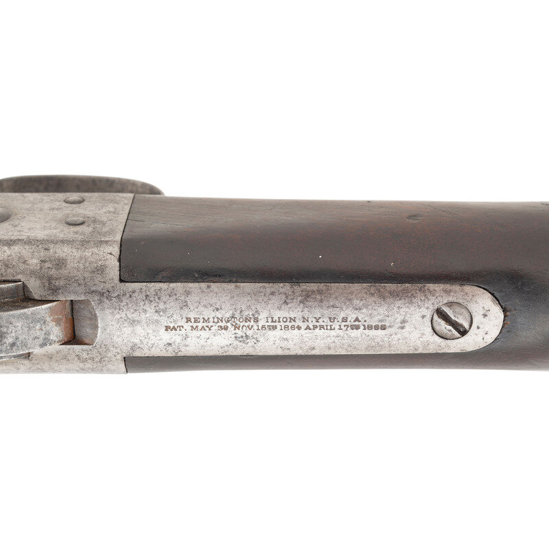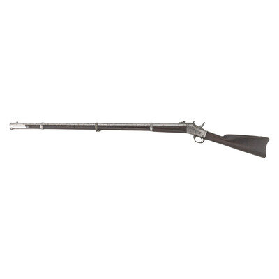 .58 CF. 39" barrel. NSN. Bright finish, iron furniture, walnut stock and forend. Alteration of a Civil War era M1863/64 musket to a breech loading cartridge rifle with a Remington Rolling Block action. Features include three solid rounded spring retained barrel bands, a US M1861 3-leaf rear sight, a combination musket pattern front sight and socket bayonet stud and sling swivels on the triggerguard bow and middle barrel band. Standard Remington tang markings. A script ESA cartouche is present on the reverse wrist but appears spurious. An incorrect tulip head ramrod is present. {ANTIQUE}