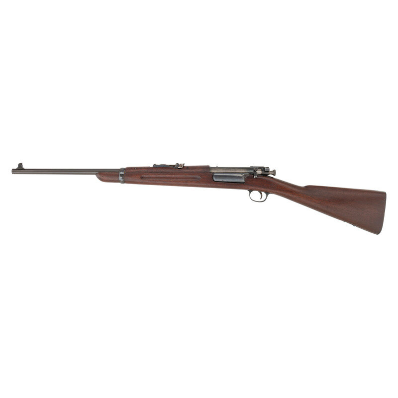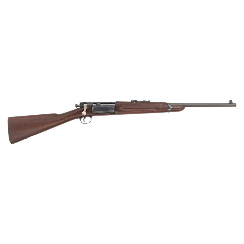 .30-40. 22" barrel length. SN: 144655. Blued metal finish with polished bolt and nitre blued small parts set in a walnut straight wrist stock with half length handguard retained by a single barrel band and no provisions for using a sling. Bolt action internal magazine fed repeating rifle loaded via a trapdoor to the right receiver. Receiver marks read MODEL 1898. followed by U.S./SPRINGFIELD ARMORY. Wrist shows a circle P marking and the boxed JSA/1899 cartouche of Joseph S. Adams. Sights consist of a model 1902 rear notch with the right sight base struck C for carbine and paired with a standard Krag rifle upper handguard. {C&R}