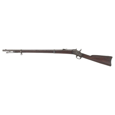 .50-70. 32.5" barrel. NSN. Bright and color casehardened finish, iron furniture, walnut stock and forend. Single shot breechloading rolling block action naval rifle with M1868 pattern ladder rear sight, musket front sight, saber bayonet lug under barrel, sling swivels and a single shoulder jag head cleaning and clearing rod. Action marked USN/SPRINGFIELD/1870 on obverse and barrel inspected with a P/HBR. An illegible cartouche is present at the wrist. Tang with Remington patent markings. {ANTIQUE}