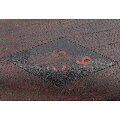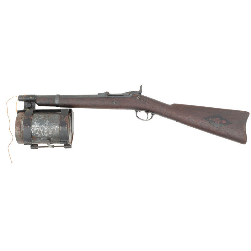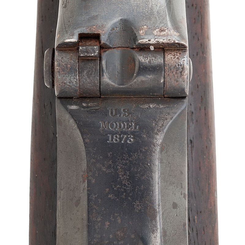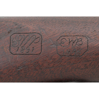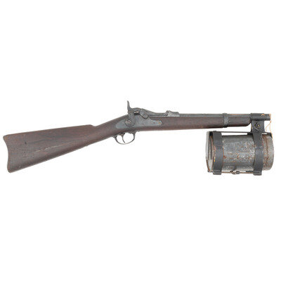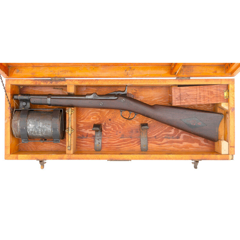 .45-70 Line Blank. 12" barrel length. SN: 534340. Reblued metal finish with black paint to drum components mounting a walnut straight wrist stock with one barrel band and a US marked buttplate. Single-shot trapdoor action line throwing gun built using components from Springfield Trapdoor Rifles. Lockplate is unmarked, and the model mark to the breeechblock reads U.S/MODEL/1873. Rear sight has been removed with thread protector screws put in its place. Stock shows a faint circle P behind the tang, and a strong SWP/1891 cartouche of Samuel W. Porter followed by two owner's marks applied in a pattern inspired by the cartouche, the initials EWB/1945 and a further mark that is illegible. Bore smoothed to accept brass rods. Barrel fitted with a steel clamp containing a detachable steel can containing a line spool. Item comes with a line spool in the can, one inserted brass line throwing rod, and two reloads in the case. Comes in a wood case with brass corners and latches. {ANTIQUE}
