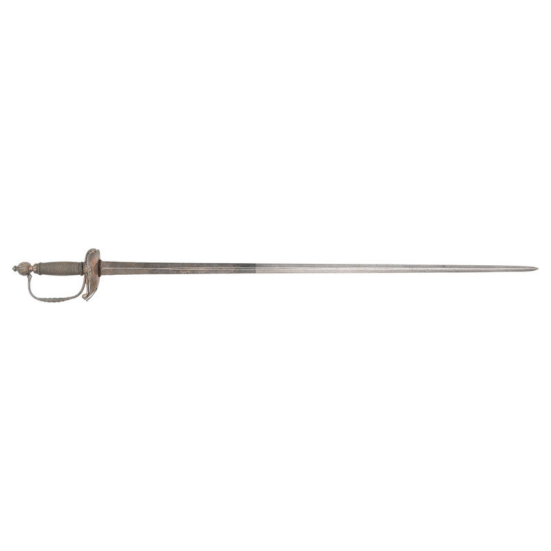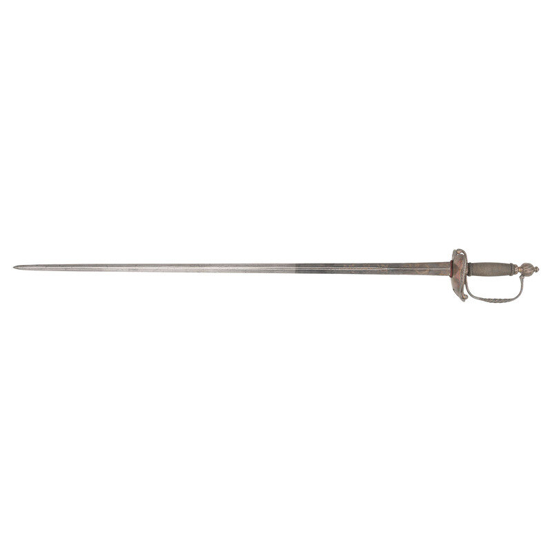 32" straight, double edged diamond shaped blade with spear point, 1" wide at the ricasso. Overall length 39". Silver or silver alloy hilt is 6" with tapered lobe shaped guard and counter guard, D-shaped knuckle bow and pas-d'nae. Bulbous reeded pommel cap, cast twisted wire pattern on grip with Turk's head rings at either end. No maker or touch marks are noted on the hilt. Blade partially blued with gilt etched decorations including the British coat of arms and floral patterns with both sides of the blade reading For My Country & King. No scabbard is present.