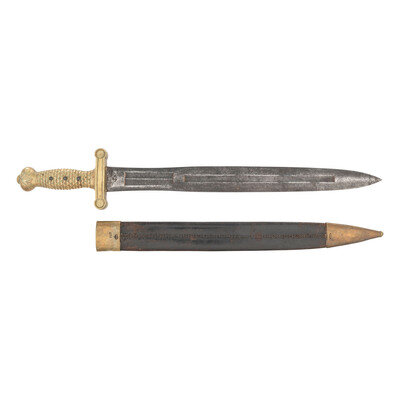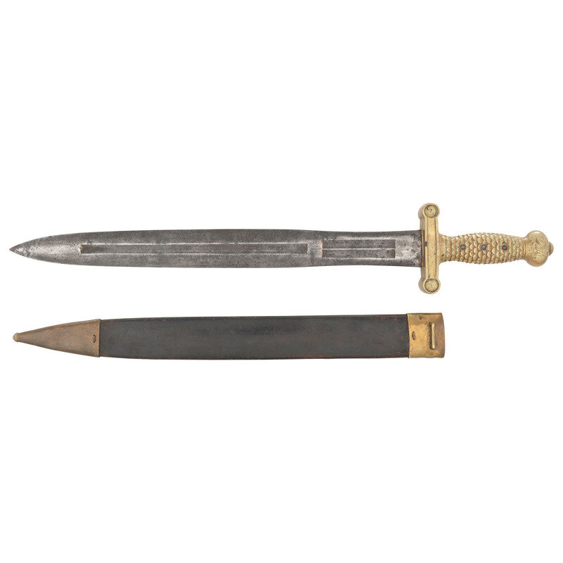 19" double-edged wasp-waisted spear point blade with a 10.5" long double stopped median fuller and a pair of 3.25" secondary double stopped fullers. Blade 1.75" wide at ricasso. Overall length 25.125". 6" cast brass hilt with fish scale pattern grip and 4.125" cross guard. Obverse of blade stamped with a {Spread-Winged Eagle}/NP AMES/SPRINGFIELD with the reverse stamped UNITED/STATES/1835. Face of guard with ORD stamp, the HKC cartouche of US Ordnance Officer Henry Knox Craig and the italicized JM of civilian sub-inspector Justin Murphy. The sword is accompanied by an incorrect brass mounted leather scabbard that is likely of Continental origin, which is slightly too short for the sword to seat fully.