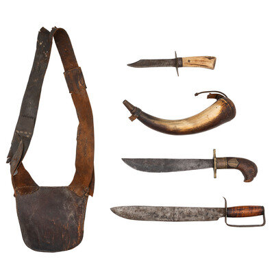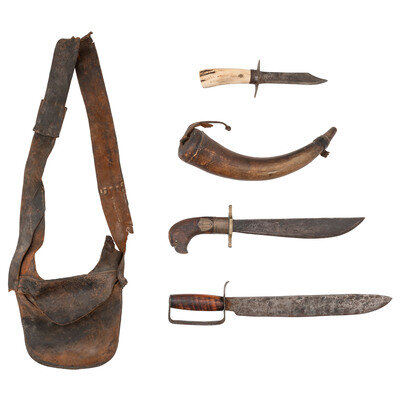 Bowie knives range from 5.75" to 13" blade lengths with the longest example featuring an iron knuckle bow and walnut handle with applied tiger stripe pattern, smallest with stag horn handle, and the third with brass guard struck JII and VIII, and featuring a walnut eaglehead pommel and shield escutcheon to both flanks. Knives lack visible maker markings. Powder horn is 13" long and features a wood plug secured with iron tacks, and retains traces of leather sling that has broken off. Possibles bag is empty and has a restitched shoulder strap.