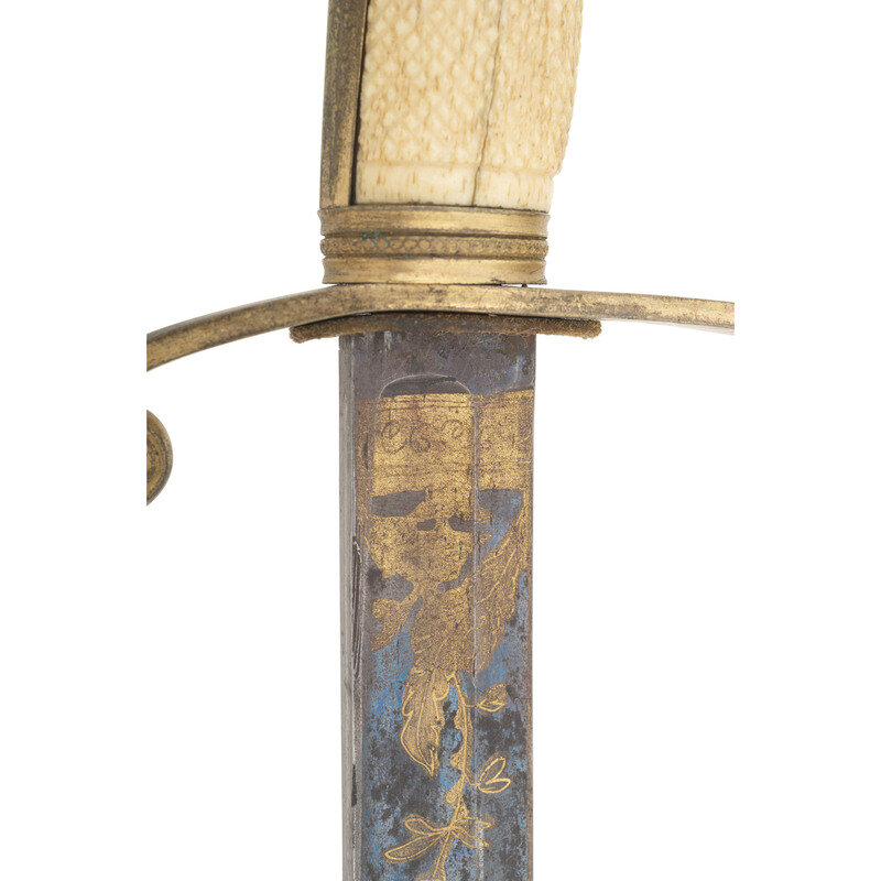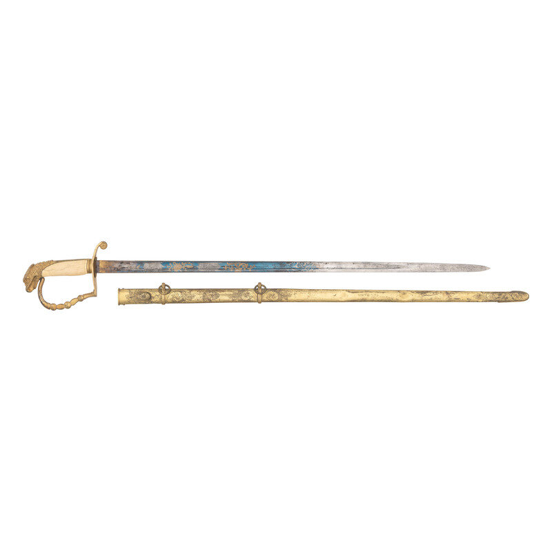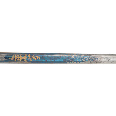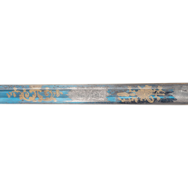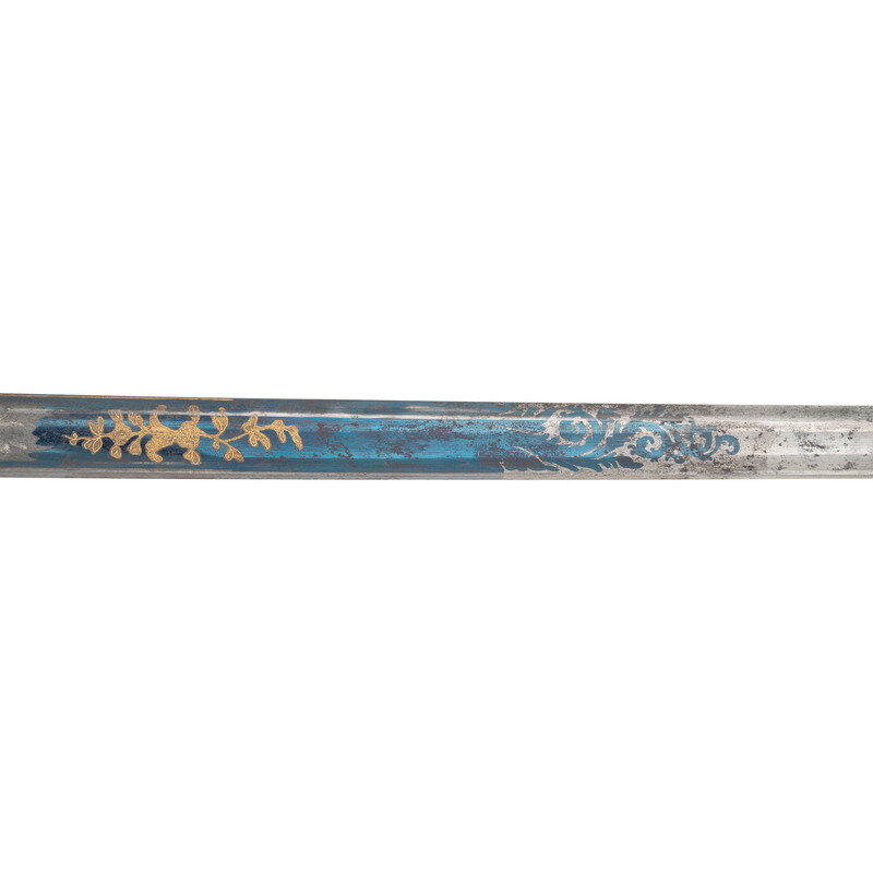 29.75" straight, single edged spear point blade with 22.75" stopped median fuller. 1" wide at ricasso. 35" in overall length. 5.5" Eagle pommel hilt of gilt cast brass with "reverse P" knuckle bow, full backstrap, and forward swept upper quillon. Checkered bone grip. Blade decorated with blue and gilt floral, martial and patriotic motifs. Sword is accompanied by an engraved sheet brass scabbard with two suspension rings and a frog button.