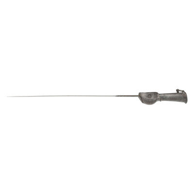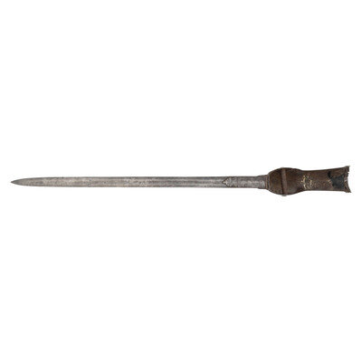 33.5" double edged, straight spear point blade, 2" wide at ricasso. Overall length 44.5". Steel gauntlet hilt is 11" long with hand grip inside and a .5" linked wrist support chain. Unmarked other than an old museum style catalog number inside the gauntlet in white ink. Cosigner's notes suggest an age of circa 1780, but more likely 19th century.