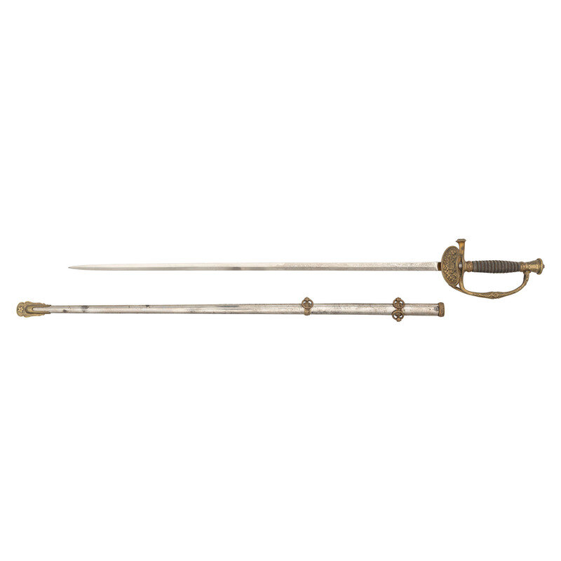 28.5" straight, double edged spear point blade with prominent median ridge, .75" wide at the ricasso. Overall length 35.25". 6.5" hilt with gilt cast brass knuckle bow, clam shell guard and folding counter guard. Faces of both guards chased with martial and patriotic themes. Urn shaped pommel cap with American Eagle and foliate motifs. Grooved grip covered in shagreen with 13 wraps of twisted wire. Balde decorated with etched foliate, martial and patriotic images. Obverse ricasso etched The Pettibone/MFG. Co. Cincinnati, O in three lines in a ribbon. Includes a nickel plated brass mounted scabbard with dual suspension rings on the upper mount and one on the middle mount.