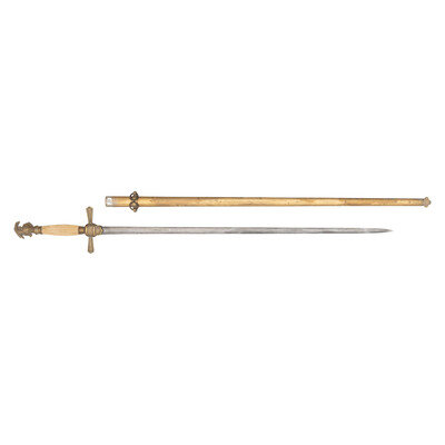 27.5" double edged straight, unfullered spear point blade, .75" wide at the ricasso. Overall length 34.75". 7" hilt with cast brass cross guard, shield shaped langets, and a Knight's Head Pommel with the helmet surmounted by a Spread-Winged Eagle. Reeded bone grip. Ricasso marked under the langet with an A.A. Schnitzler makers mark, placing the sword no earlier than about 1864, after the dissolution of S&K (Schnitzler & Kirschbaum). The sword is accompanied by a silvered brass scabbard with dual suspension rings near the throat.