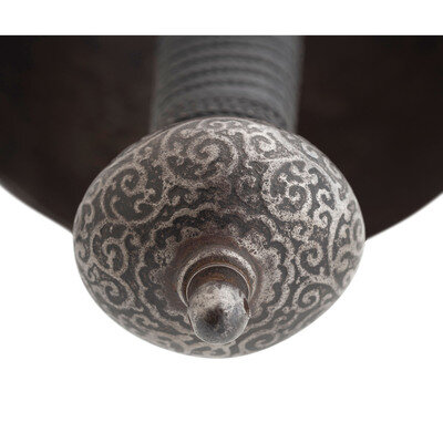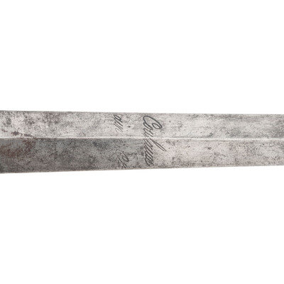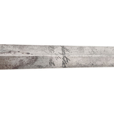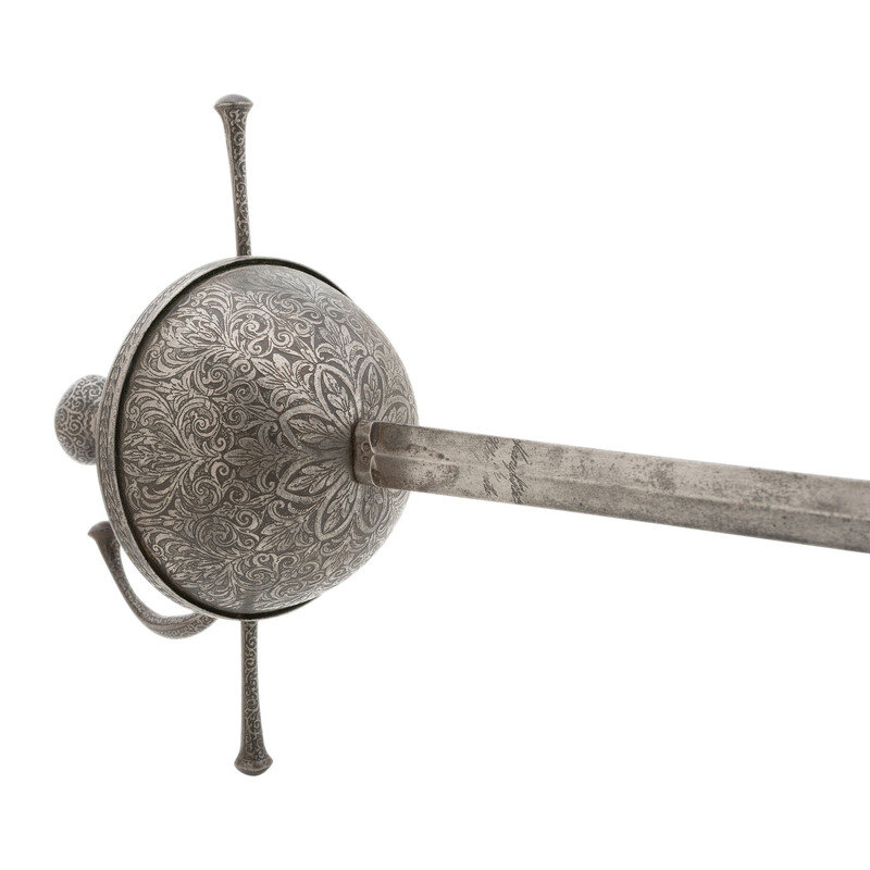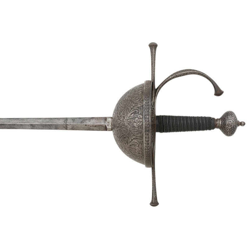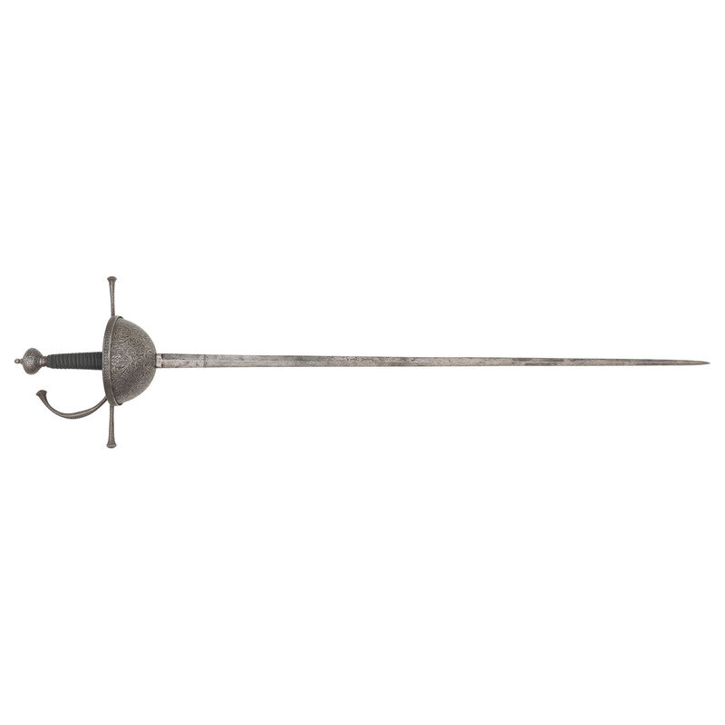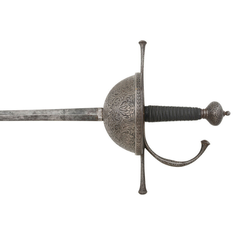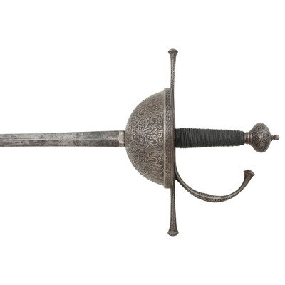 34.25" tapered doubled edged spear point blade with diamond cross section, .9" wide at ricasso. Overall length 43.5". 6.5" hilt with 5.25" diameter cup guard, 2.25" deep and deeply etched with floral patterns. 10.125" long cross guard etched in the same style with bulbous quillons. Two large pas-d'anes, leather covered grooved grip with 16 wraps of twisted wire. Bulbous pommel cap. Obverse of blade with Klingenthal maker's mark and the reverse with the Coloux mark, suggesting the blade is circa 1801-1806 and obverse ricasso with {Crown}/B and {Crown}/D controller and inspection marks. Apparently a late Spanish rapier, from the first quarter of the 19th century using a commercial Klingenthal blade.