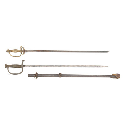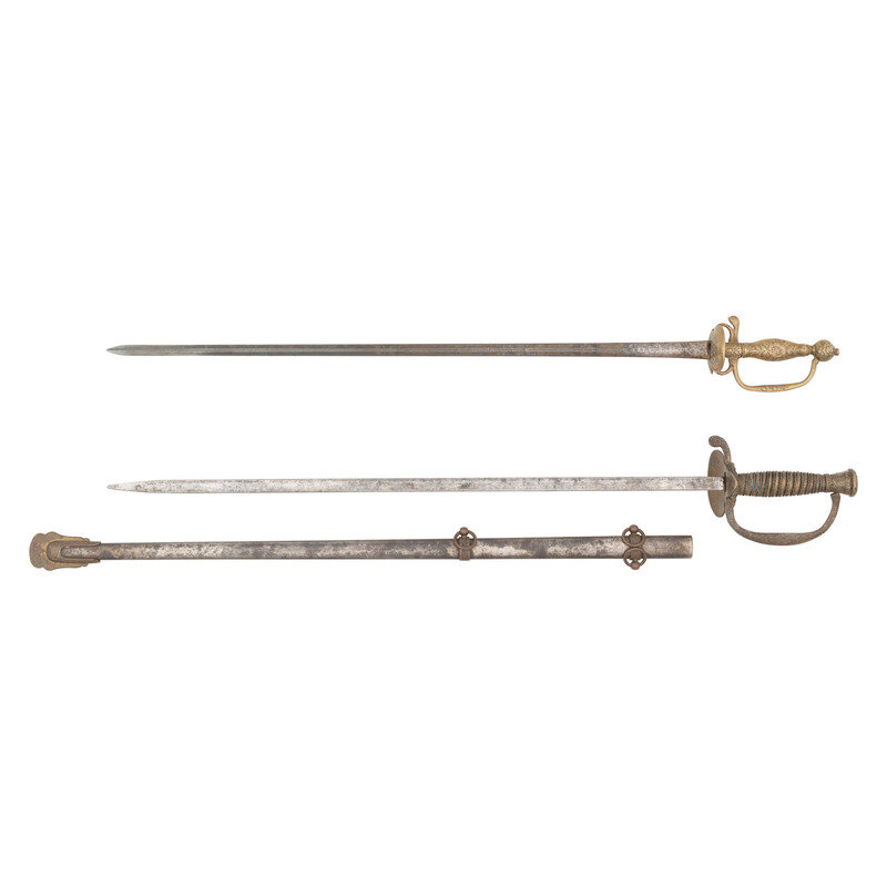 2) 22" straight spear point blade without an edge, .5" wide at the ricasso. 27" in overall length. 4.5" cast brass guard with clam shell guard, D-shaped knuckle bow and urn pommel. Cast with floral and patriotic motifs. Grip with cast twisted wire grip. Includes a browned steel, brass mounted scabbard.