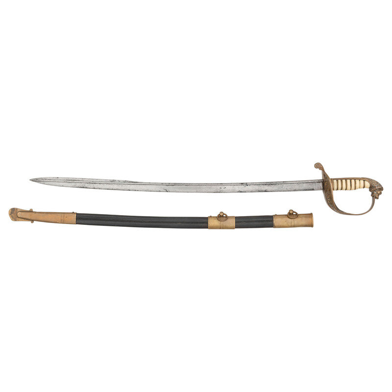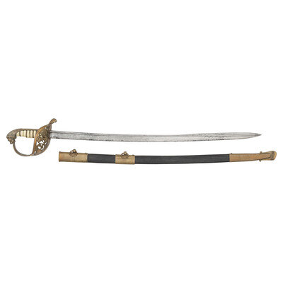 28" slightly curved, single edged spear point quill back blade with pipe back spine, 1" wide at ricasso. Overall length 34.25". 6" hilt with cast brass open work half-basket guard with naval and floral motifs and lion's head pommel. Grooved bone grip with 7 wraps of multi-strand wire. Etched blade with floral, nautical and patriotic motifs and marked M. PAUWELS & C/ROTTERDAM/AMSTERDAM on the obverse and YZERHOUWER on the reverse. Includes a brass mounted leather scabbard.