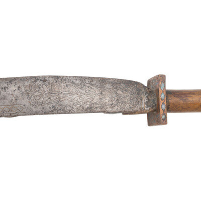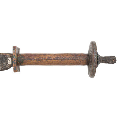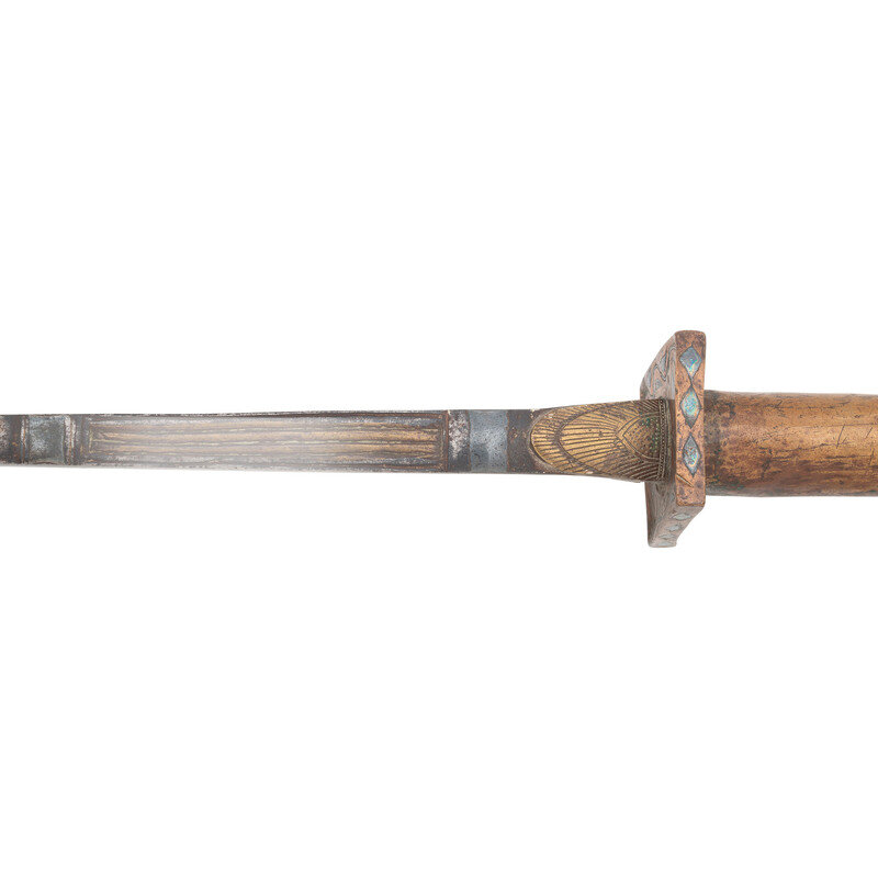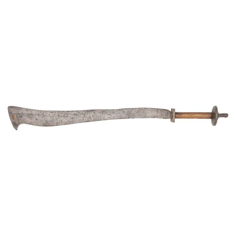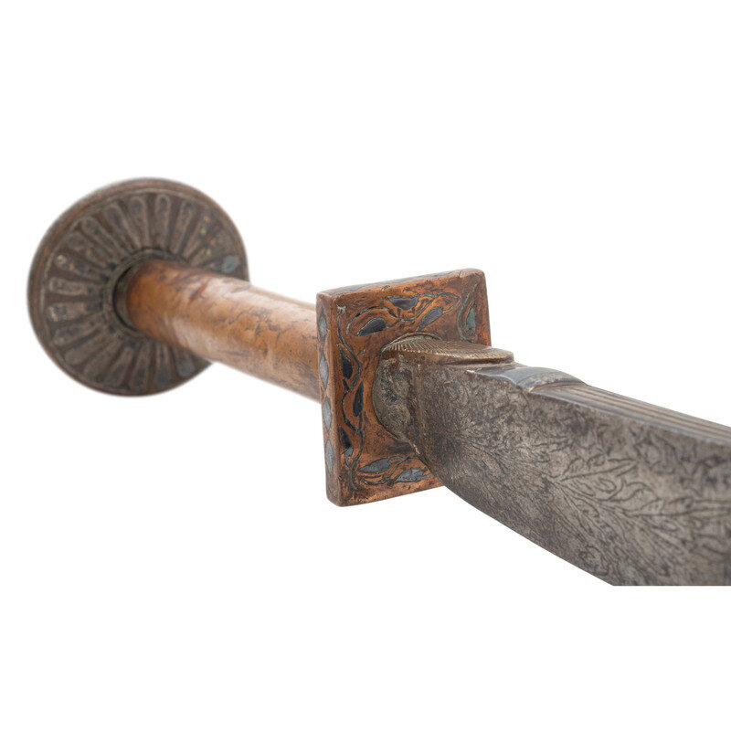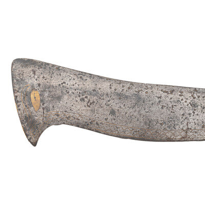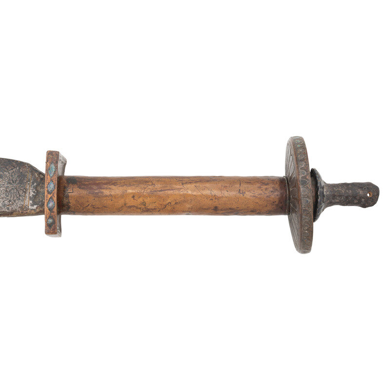 31" curving blade with blunt tip and reverse hooked bill, creating the rudimentary silhouette of some sort of creature, possibly a rhinoceros. Blade 4.75" wide at widest point, and .82" thick at the spine, near the ricasso. Overall length 42". 10" two-handed hilt with round copper grip, 2" square and .4" thick decorated copper guard and sliding decorative 3.5" diameter copper disc guard at base of grip. Blade decorated with engraved foliate patterns, gilt highlights and a gilt eye near the tip. Spine decorated with brass near the hilt. These massive swords were used to decapitate buffalo during the Hindu festival of Dessehra. A massive and impressive ethnographic sword. Overall weight is just under 10 pounds, so extra shipping costs will apply.