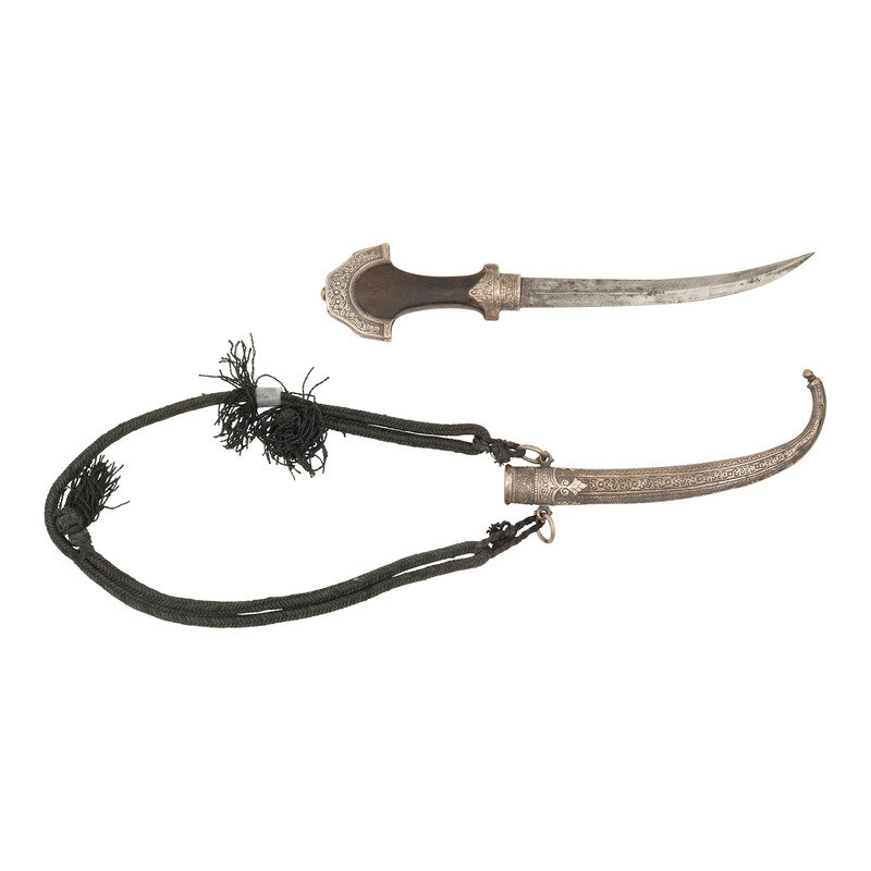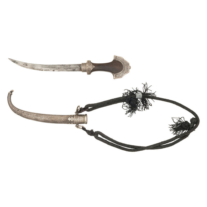 9.3" blade length. 16.5" overall with scabbard and hilt. Curved double edged blade with medial ridge and lightly engraved ricasso to obverse side displaying serpentine geometric engraving along with a hand engraved {Eiffel Tower} above the word LUORIELLE. Scabbard and hilt appear to be silver mounted with a wood core to the scabbard and an ebony handle. Scabbard and hilt show traditional embossed Arabesques with floral motifs. Traditional dagger of the Berber and Arabic peoples of Morocco.