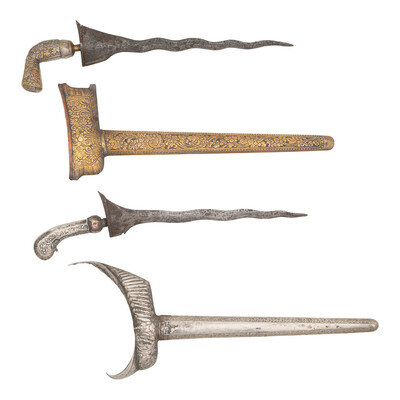 2.) 12.5" blade length. 18.75" overall with scabbard and hilt. Double edged serpentine wootz steel blade with spearpoint tip mounting a pistol grip hilt with brass ferrule and embossed floral and geometric patterns. Scabbard is composed of a nonferrous metal with patterns matching the hilt, both of which appear to be washed in a gold color and made of tin or similar materials.